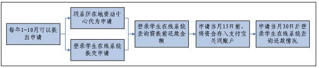 假设张三为陕西省西安市临潼区人,2008年被西北大学录取,学制4年。当年8月到临潼区资助中心申请国家开发银行生源地贷款,申请贷款5000元,贷款期限14年。该生报到后在规定期限内将借款合同回执寄回区资助中心,回执确定的学费和住宿费欠缴金额为4500元。经开发银行审批通过后,支付宝将4500元划付西北大学,剩余500元用于张三生活费。
