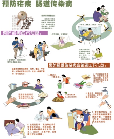 | 1、传染病传播的方式和途径: 第一,通过空气从呼吸道传染第二,通过食物经消化道传播。 第三,通过昆虫及动物传染。 第四,通过日常接触传染。 第五,通过血液传播。 2、预防传染病的环节: (1)控制和消灭传染源; (2)切断传播途径; (3)保护易感人群。 二、 常见传染病及预防  1、肺结核 介绍:由结核杆菌在肺部感染而引起的慢性呼吸道传染病。 预防措施: (1)最好与人分室居住,分开吃饭,定时将碗筷消毒。 (2)不要随地吐痰。 (3)及时到医院检查:明确疾病性质及范围,谨遵医嘱。 2、 乙型肝炎 介绍:乙肝是乙肝病毒引起的以肝脏疾病为主的全身疾病。主要经血液、体液、母婴传播。 预防措施: (1)注意就餐卫生。 (2)尽量不与他人进行共餐。 (3)食用卫生检验合格的食品。 (4)阻断传播途径,定期注射乙肝疫苗。 3、流行性感冒 预防措施: (1)应注意分开使用生活用品。 (2)避免长时间在公共场所逗留。 (3)勤洗手、多喝水、带口罩,注意个人卫生。 4、甲型H1N1流感 介绍:症状与感冒类似,患者会出现发烧、咳嗽、疲劳、食欲不振等症状。感染病毒的患者也以青壮年为主。 部分患者病情可迅速进展,来势凶猛、突然高热、体温超过39℃,甚至继发严重肺炎、急性呼吸窘迫综合症、肺出血、胸腔积液、全血细胞减少、肾功能衰竭、败血症、休克及Reye综合症、呼吸衰竭及多器官损伤,导致死亡。 预防措施: (1)避免和出现不适症状、咳嗽的人密切接触。 (2)勤洗手,养成良好的个人卫生习惯; (3)睡眠充足,多喝水,保持身体健康; (4)应保持室内通风,少去人多不通风的场所。 5、水痘 介绍:水痘的主要特征为发热及成批出现周身性红色斑丘疹、疱疹、痂疹等。传染率很高,患者为主要传染源,出疹前1~2天至出疹后一周都有传染性,主要是呼吸道飞沫或直接接触传染。 预防措施: (1)养成良好的卫生习惯,保持环境整洁。 (2)保持室内通风。 (3)睡眠充足,多喝水,加强锻炼,保持身体健康; (4)避免和出现不适症状的人密切接触。 |