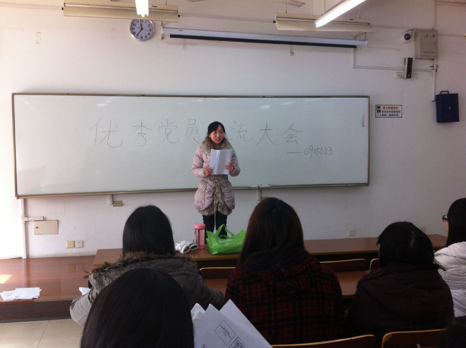 发挥党员的先锋模范作用,是学生党员应学习的另一重要方面,针对于此,0905023支部召开了“优秀党员交流大会”,由2012年度该支部优秀共产党员许菲同学向大家介绍自己的经验,分享了自己对党的认识,对于学习和生活的认知,从实际出发,彰显了学生党员的模范风采。