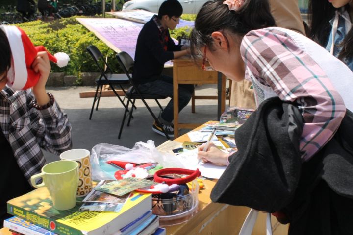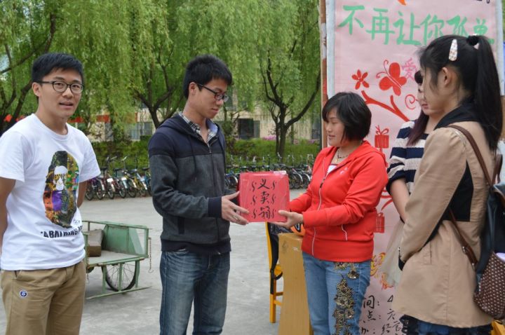 4月23号,阳光明媚的日子里,在老食堂门口,正在进行着由经管院学生为南京的孤残儿童主办的爱义卖活动。