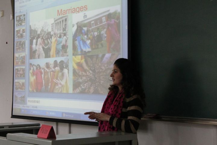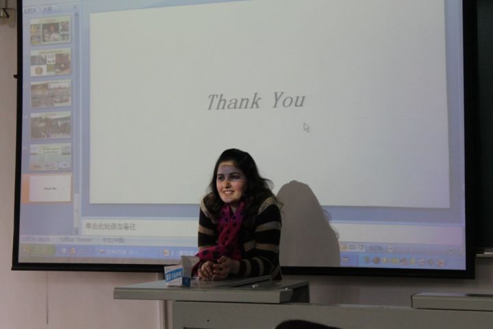 首先是Faiza老师向同学们介绍了有关巴基斯坦的人文风俗、其中谈及到谗言欲滴的各色美食、有趣的婚俗和惹人眼目的漂亮新娘,以及巴基斯坦美不胜收的著名景点,外教用丰富的肢体语言和会说话的眼睛向同学们传递着她对祖国的热爱。