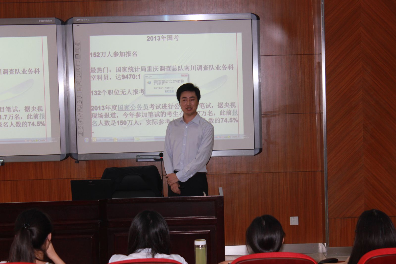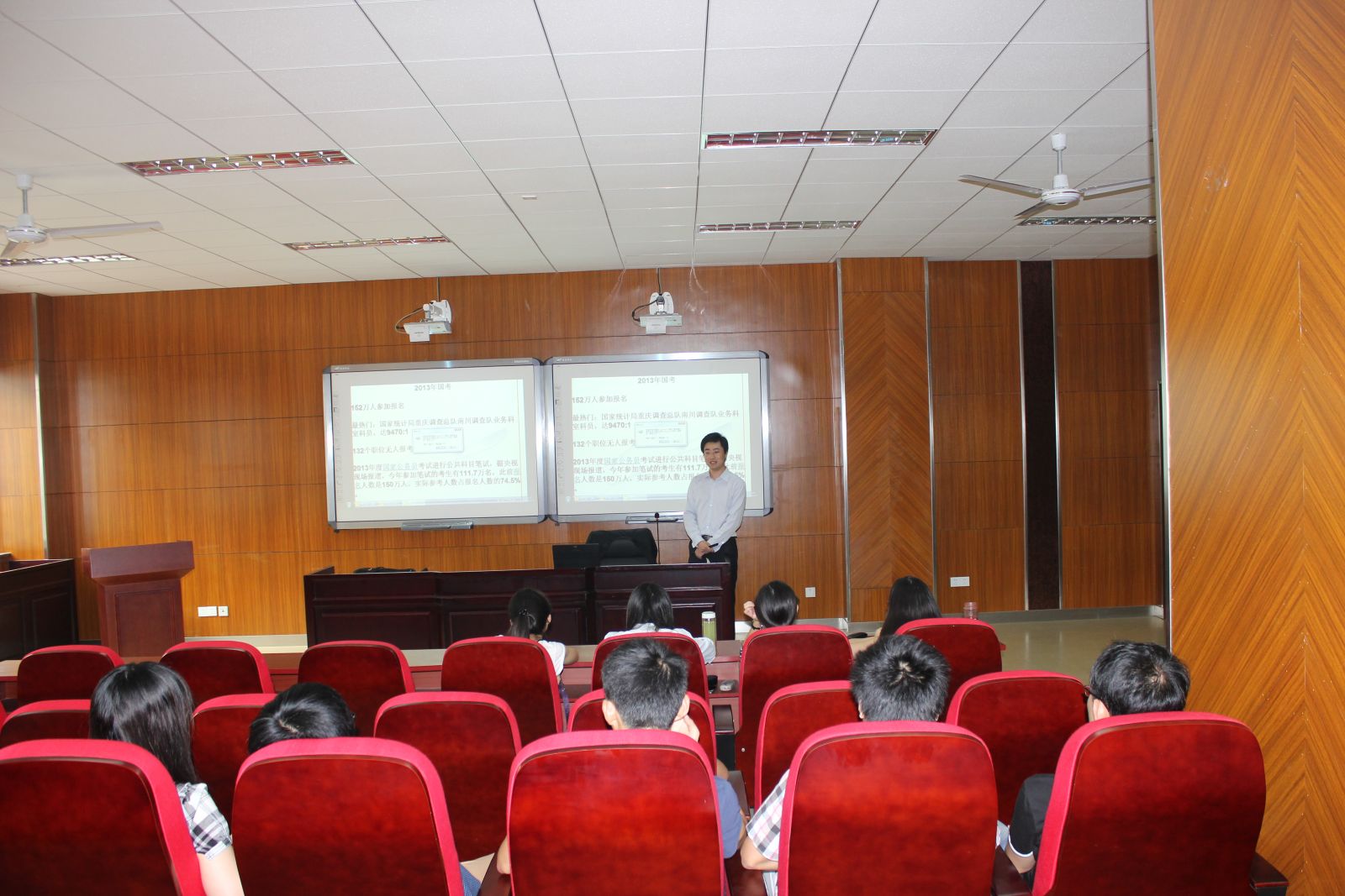 2015年国家公务员考试在即,为帮助报考我院参加国考的学生,特邀请学信学院大型公益讲座走进学院,进行针对性的国考备考讲座。公考资深辅导专家,淳信教育公考研究院名誉院长高老师就国家公务员录用考试考情考务;国家公务员录用考试具体内容及难点分析;国家公务员录用考试《行政能力测验》、《申论》解题技巧;国家公务员录用考试备考周期阶段复习计划等4方面的内容与同学们进行了交流。