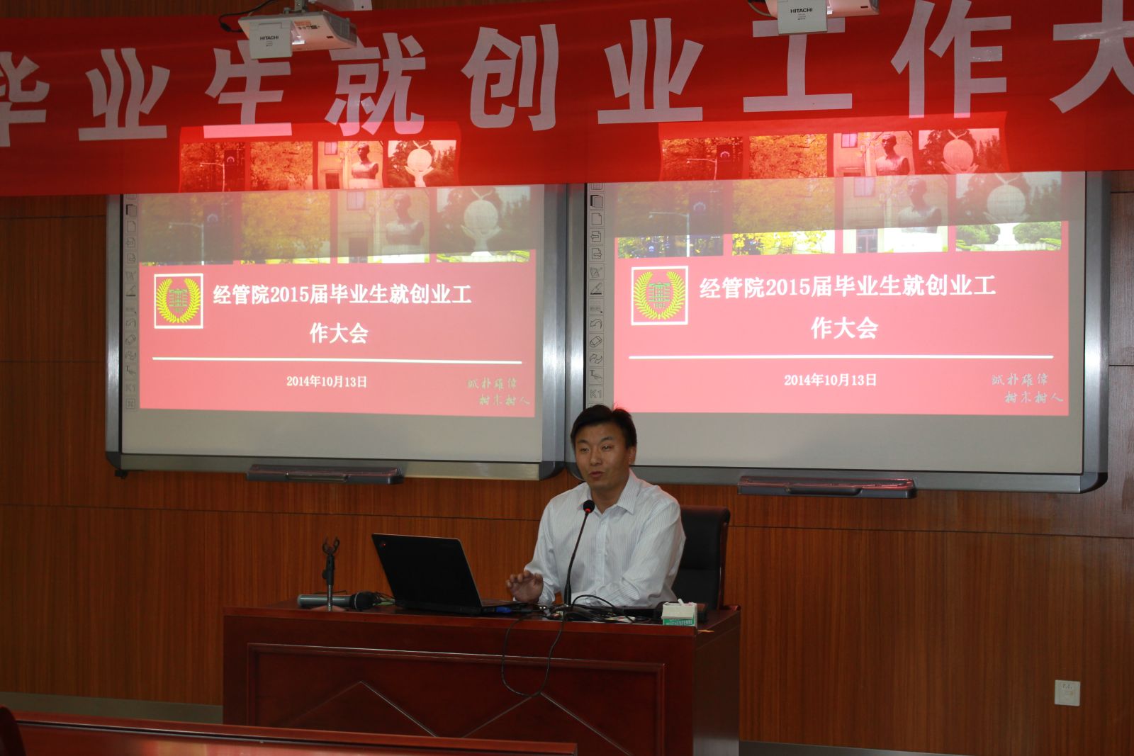 经管院顺利召开2015届毕业生就业创业工作大会 2014年10月13日、15日、17日下午,经管院在C103教室顺利召开了“2015届毕业生就业创业工作大会”。本次会议由院团委洪春奇老师主持,院党委副书记刘子超分别给我院2011级14个班级的学生做了就业、创业方面的动员和指导。 本次大会刘子超书记从“精确定位,充分准备”主题开始,用生动形象的图片及数据资料,分析了当前全国毕业生的整体就业形势,并就我校及我院2014就业情况统计数据做了具体分析,让参会的学生们清楚地了解了目前的就业形势。接着,刘书记又以“积极求职,成功就业”为主题,从成功就业的关键因素、就业目标及求职定位、就业心态、个人能力、自我定位等几方面向学生传授了求职技巧。最后,刘书记祝各位同学都能如愿以偿实现自己的愿望。 就业是民生之本,就业工作关系国家发展,关系社会稳定,关系家庭幸福,是经济社会发展不可或缺的一部分。本次我院的就业创业工作大会让学生们对就业有了更清楚的认识,充分激发了大家拼搏的热情,为大家今后的就业工作提供了切实的帮助。