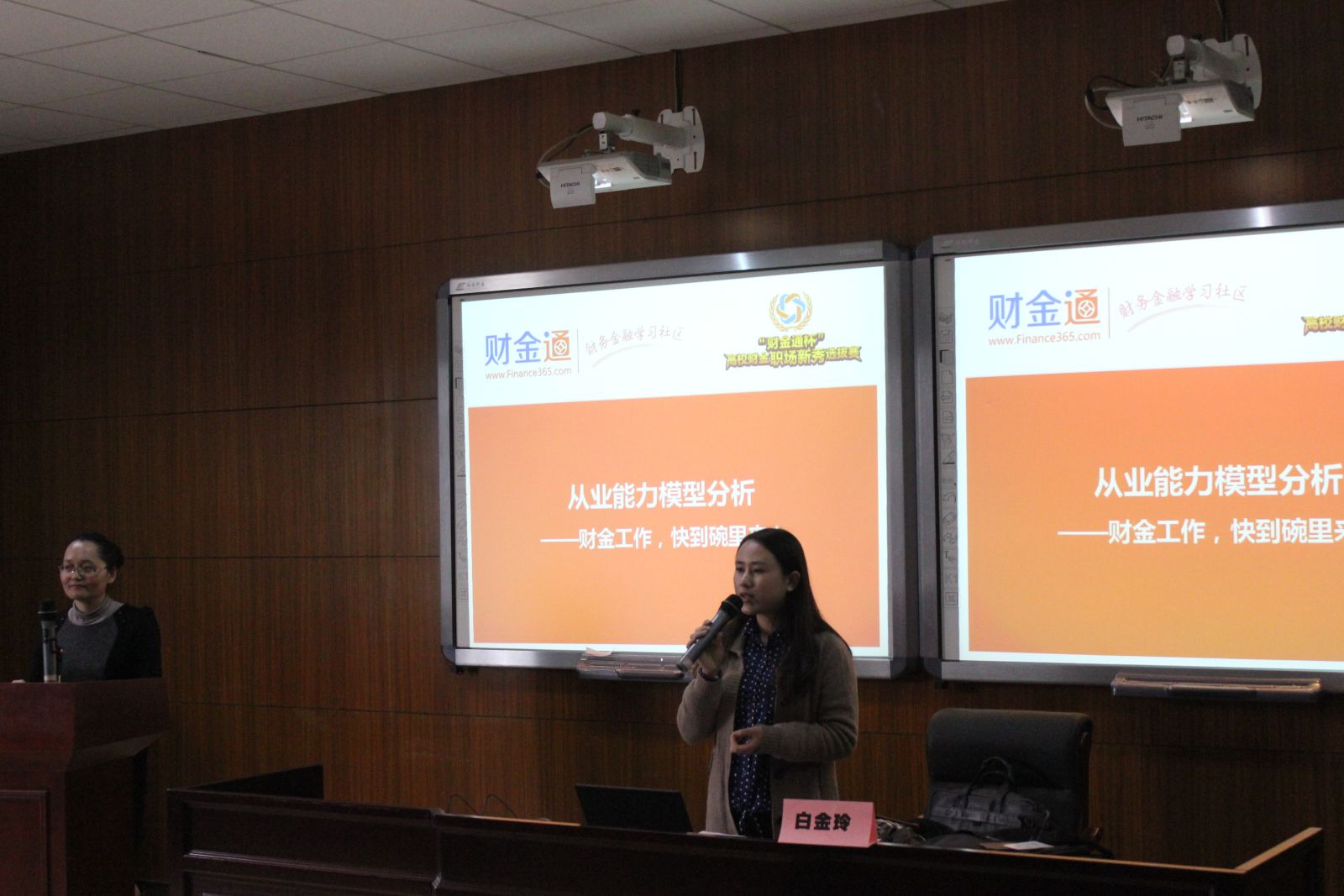 2015年4月8日下午16:00经管院在C105召开了“财金通杯”高校金融职场新秀选拔赛(以下称“财金通”)宣讲会。“财金通”是国家级的财务金融专业大赛,自开办以来已成功举办三届,在业内享有较高的声望。我院自比赛开办以来就一直积极参与大赛,曾取得较好的成绩,14年我院卢晓秋同学曾成功入围大赛十强。本次宣讲会从财金从业人员的素质模型入手,为解决经济类学生对金融行业的困惑提供了良好的交流平台。会议由白金玲老师主持,出席本次宣讲会的有12级辅导员胡潇潇、14级辅导员李政和学生代表。