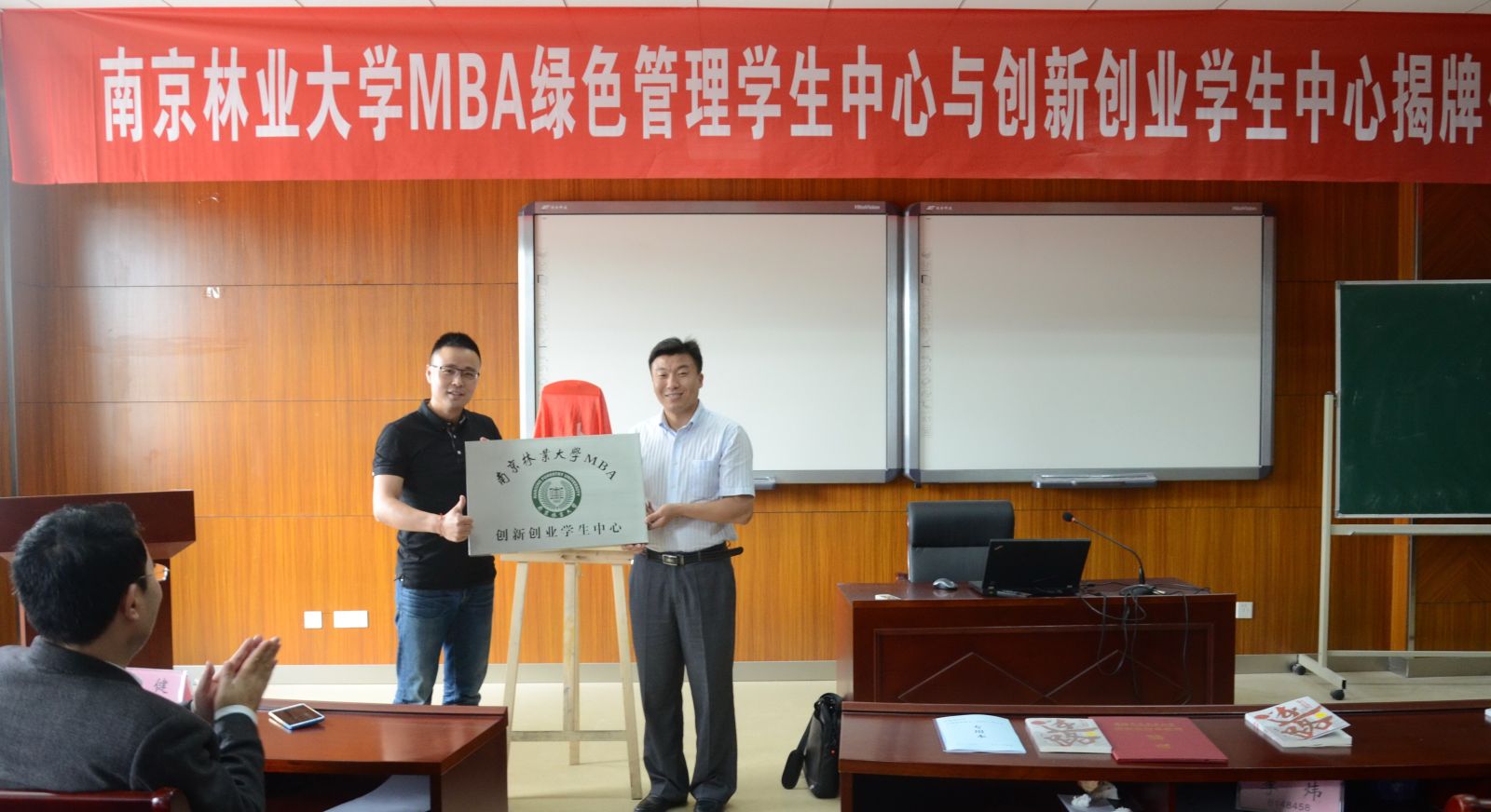 南京林业大学MBA绿色管理学生中心与创新创业学生中心授牌仪式于5月9日下午成功举办。经管院副院长杨红强、党委副书记刘子超、硕士研究生校外导师武超及2014级MBA学员参加了学生中心成立仪式。 仪式由南京林业大学MBA中心姚彦老师主持,姚彦老师介绍了南京林业大学MBA绿色管理学生中心与创新创业学生中心成立的背景和活动宗旨。经管院副院长杨红强致辞,杨院长介绍了南林MBA的发展历程,说明了成立两个中心与MBA办学定位的密切关系,鼓励两个中心由学员自主管理,努力将南京林业大学MBA绿色管理学生中心与创新创业学生中心发展成为学员成长的发展平台。 经过推荐、组织考察与公开竞聘,最终魏裕海同学被推荐为首届绿色管理学生中心主任,陆远被推荐为首届创新创业学生中心主任。经管院副院长杨红强与绿色管理学生中心主任魏裕海同学共同为绿色管理学生中心授牌,经管院副书记刘子超与创新创业学生中心主任李炜共同为创新创业学生中心授牌。两位新聘主任进行精彩的任职演讲,阐述了绿色管理学生中心与创新创业学生中心未来发展的远景规划及目前活动计划与方案。 南京林业大学MBA教育秉承“立足江苏、面相长三角区域现代服务业和制造业中小企业,培养具有绿色管理理念和卓越创新创业能力的中高级工商管理人才”的办学目标和办学定位,绿色管理学生中心与创新创业学生中心的成立,将有力促进南京林业大学MBA办学目标的实现和MBA教育的发展。