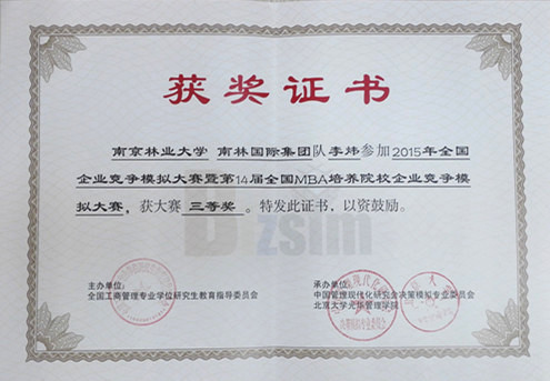 “第十四届(2015)全国MBA培养院校企业竞争模拟大赛”总决赛于4月29日--4月30日在北京大学进行,我校MBA代表队--南林国际集团,与来自全国各地二百多所大学(包括香港、澳门、台湾地区)MBA代表队同台竞技,经过激烈对抗,首次参赛的南林MBA代表队获得大赛三等奖的优秀成绩。