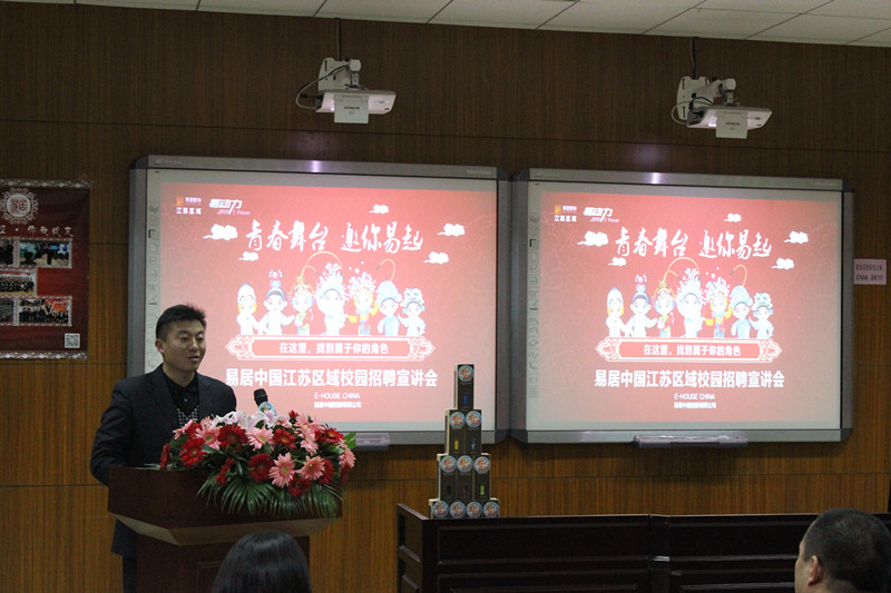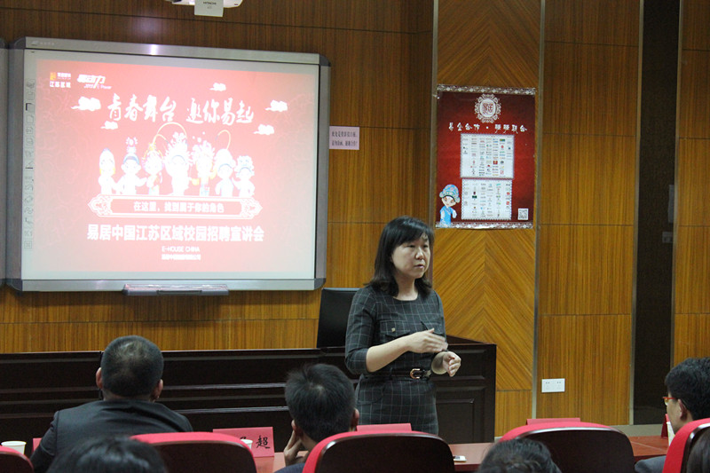 为了让应届毕业生得到更多的就业机会,也为了让企业能获得更多优质的应聘者,经济管理学院携手易居营销集团江苏区域于11月11日下午3点整在经济管理学院C105召开了“易居中国江苏区域校园招聘宣讲会”。全会围绕“青春盛会,邀你易起”的主题展开。此次宣讲会出席的有经济管理学院副书记、副院长刘子超,易居营销集团江苏区域管理总张成,法务总监赵琦,行政人事部总监吴小莉,经管院12级辅导员胡潇潇以及刚加入易居中国的徐利学姐和许菲学姐。易居营销集团行政人事部的李明轩主持了此次宣讲会。