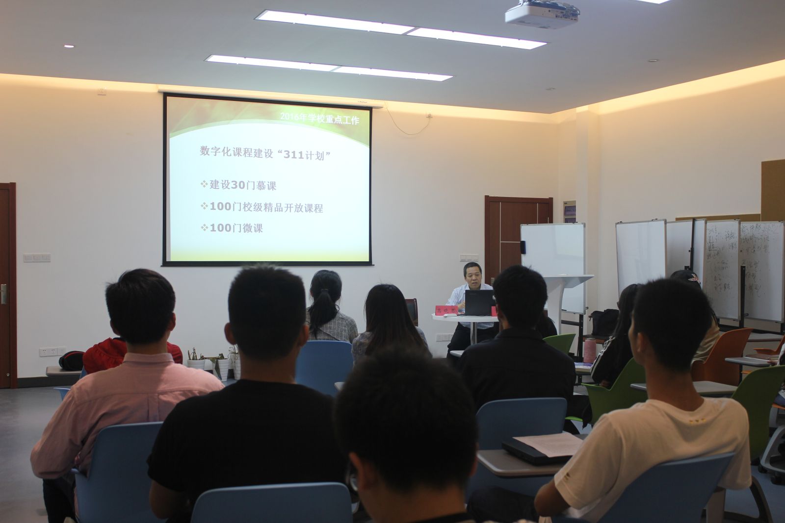 2016年4月13日下午4点教十一楼B138,我校大学生计算机竞赛指导教师常继锋副教授来院与老师们就如何利用计算机辅助工具上好微课进行了交流。首先,常教授介绍了微课产生的背景及微课的价值,教师可以利用微课让学生们学习起来更自觉更有效,他认为随着手持移动数码产品和无线网络的普及,基于微课的移动学习、远程学习、在线学习、泛在学习将会越来越普及,微课必将成为一种新型的教学模式和学习方式,也势必在未来成为一种教学潮流。接下来常教授介绍了微课在我们学校的发展以及首届微课大赛的情况。最后,就“如何打造属于自己的微课”与老师们进行了交流和讨论。