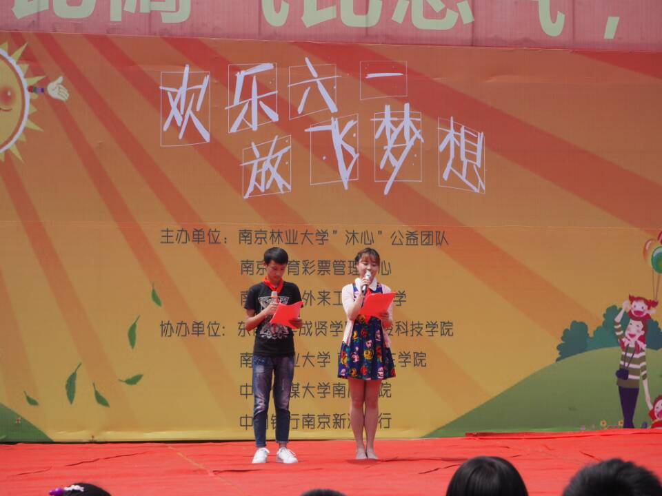 有人说,童年是人生最宝贵的一笔财富。为了关爱外来工子弟子女,给孩子们的童年留下美好的记忆。5月30日,由南京林业大学“沐心”公益团队、体彩中心及南京宁燕外来子弟小学主办,中国银行新港支行、中国传媒大学南广学院、南京工业大学及南京晓庄学院协办的2016年度“欢度六一,放飞梦想”文艺演出在南京宁燕外来子弟小学举办。此次文艺演出由南京林业大学的芦鑫及南京宁燕外来工子弟小学的吕新未一同主持。