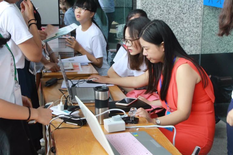 为做好迎新工作,我院学生会与团工委联合组成志愿者服务队,在体育馆帮助新生们完成注册,领取学习、生活物品,以及入住宿舍等相关事宜。