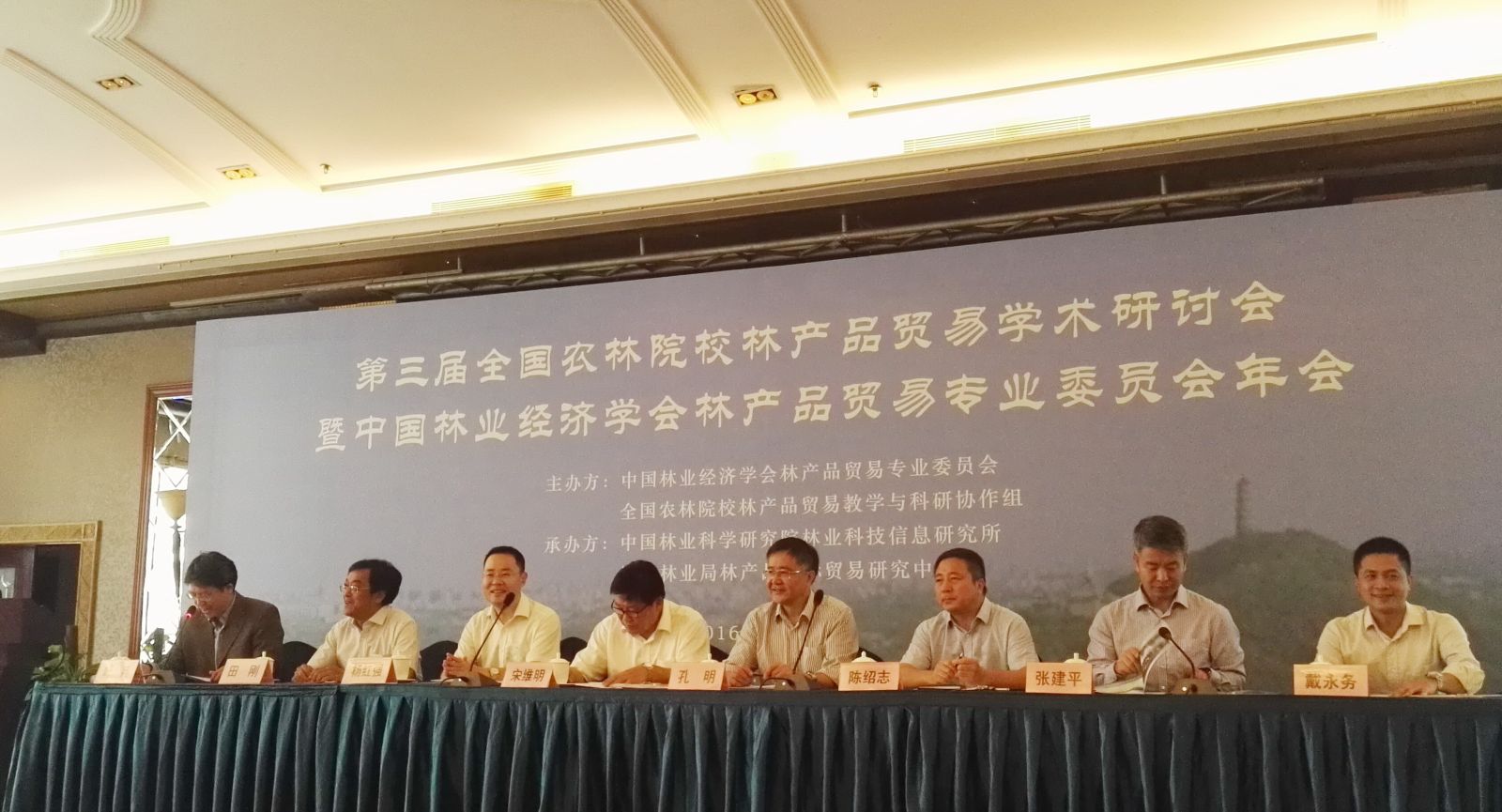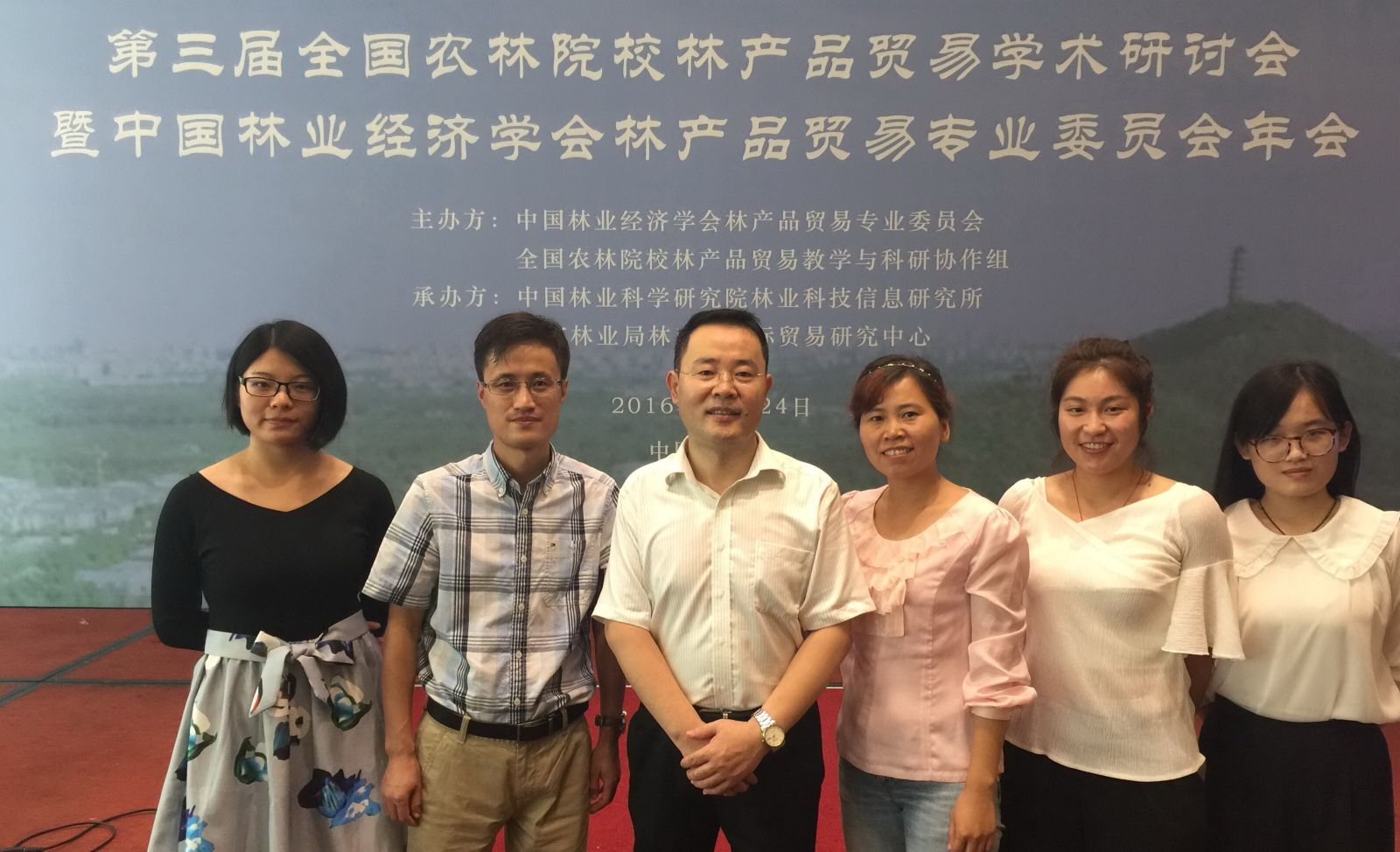 2016年9月24日,第三届全国农林院校林产品贸易学术研讨会暨中国林业经济学会林产品贸易专业委员会年会在北京召开。会议由中国林业经济学会林产品贸易专业委员会、全国农林院校林产品贸易教学与科研协作组主办,由中国林业科学研究院林业科技信息研究所和国家林业局林产品国际贸易研究中心承办,来自中国林科院、北京林业大学、南京林业大学、东北林业大学、福建农林大学、浙江农林大学等70多名师生代表参加了会议。会议开幕式上,国家林业局发展规划与资金管理司孔明司长,中国林业经济学会林产品贸易专业委员会主任、北京林业大学校长宋维明教授以及中国林科院科信所所长陈绍志教授进行了致辞。 我院副院长杨红强教授、彭红军副教授、耿利敏老师及博士硕士研究生参加了会议。杨红强教授作了题为《中国林业国家碳库及预警项目研究进展》的主题报告;耿利敏老师作了题为《产业空间结构、比较优势演化与林业产业升级路径选择》的专题报告。会议增选杨爱军、彭红军为中国林业经济学会林产品贸易专业委员会委员。会议评选了优秀学术论文,我院耿利敏老师获得优秀学术论文一等奖,彭红军副教授、博士生张旭芳、张小标等分别获得优秀学术论文二等奖。