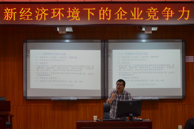 讲座首先从中国经济进入了新常态、电子商务等新型方式的崛起、供给侧改革、互联网引发的巨大模式变革等方面分析了企业所面临的新经济环境,以及新经济环境对企业生产、经营以及战略发展所带来的压力和机遇。吴总运用生动的企业案例和自己丰富管理决策经验讲述了企业如何面对环境改变成功与不成功的策略选择。吴总在讲座中不断提到生态圈和生态链的说法,提出商业生态的改变,重构商业规则。即目前产业面临的社会生态、行业生态,而构建生态的基础就是大数据。传统企业只有构建出自己的互联网生态中,才能在新的挑战中屹立不倒。讲座列举了大量大家熟知的品牌故事,柯达集团的从辉煌到毁灭,后起之秀——小米、美图秀秀、河狸家等创造的一片新的天空。吴总通过详细介绍乔恩工作的运作机制,生动地阐释了新形势下的公司应对机制。