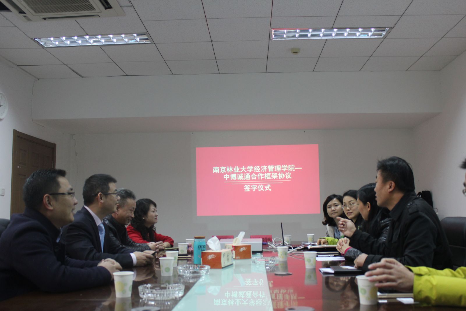 院党委书记高晓琴致辞,对陈锋副总裁一行表示欢迎并介绍了学院基本情况,对企业方对学院教学、科研、实践等相关工作的支持给予肯定,希望双方进一步深化合作,实现共同发展。陈锋副总裁在讲话中回顾了公司与南林的合作历史,对南林经管院在人才培养等方面的成绩给予高度评价,表示公司将以战略合作协议签订为契机,继续推动双方交流合作更上一层楼。仪式上,南京分公司总经理卢江与经济管理学院党委副书记、副院长刘子超签订经济管理学院与中博诚通战略合作协议。