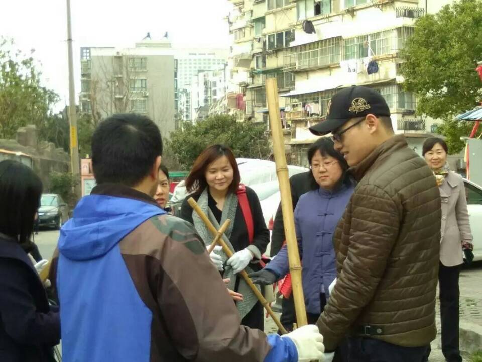 下午两点,清扫工作正式开始。女老师负责绿化带内小型垃圾清扫,男老师兵分两路,一路协助女老师,另一路负责垃圾回收。在社区工作人员的部署下,每一个人各司其职,带着热情投入其中。但大部分人对于垃圾清扫的装备的使用不得要领,垃圾剪夹上的垃圾,在最后集到垃圾袋的时候,不幸掉落;堆积好的垃圾,被大扫帚的一个“风卷残云”的招式而打散。在环卫工人的指导下,大家渐渐与装备熟识了起来,清扫工作高效率地进行着。