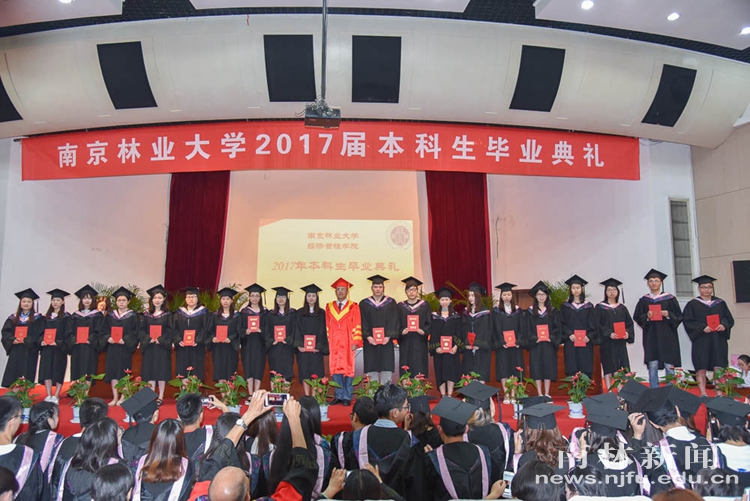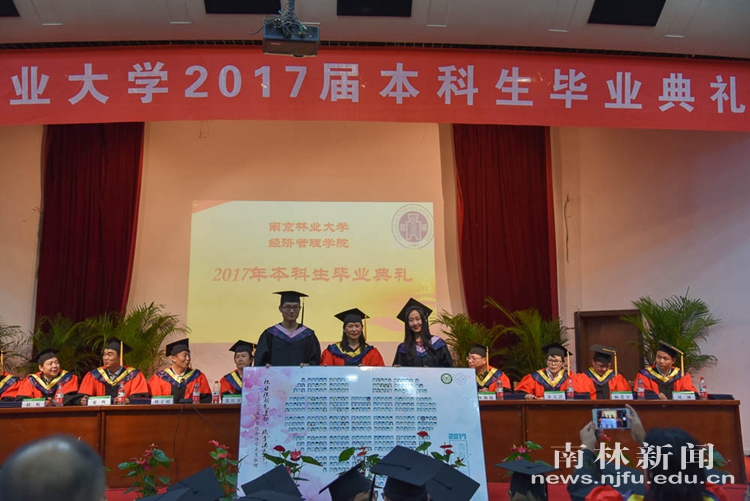 6月13日,南京林业大学经济管理学院2017届本科生毕业典礼暨学位授予仪式在教五楼报告厅举行。南京林业大学副校长王培君,经济管理学院党委书记高晓琴,副院长张红霄,副院长杨红强,副院长杨加猛,党委副书记、副院长刘子超及各系主任、辅导员、班主任代表出席典礼,451名2017届毕业生依次上台接过导师们亲手颁发的毕业证书、学位证书,并由导师们正冠拨穗。
