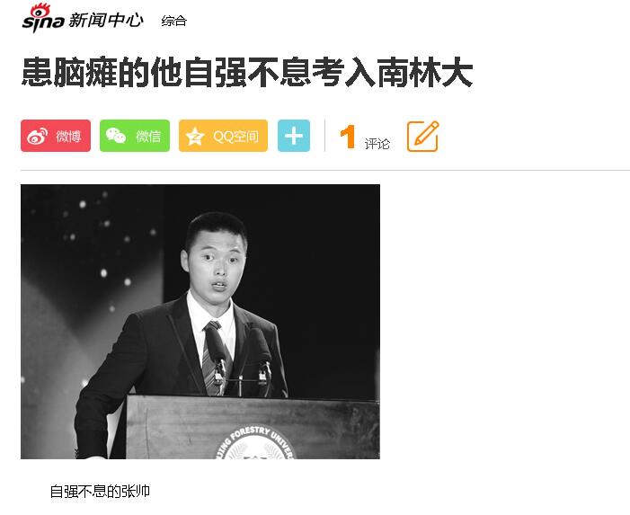 虽然身患脑瘫,但是从进入南京林业大学起,张帅在心态上发生了根本的改变,从觉得自己是运动上的弱者,转变为相信通过自己的努力会成为真正的强者。只要努力就可以克服先天身体上的不足,和其他同学一样生活学习。张帅积极投入到各门科目的学习,树立明确的学习目标,凭借自己顽强的意志和不屈不挠的努力,各科成绩均在80分以上,绩点3.0以上。在学好书本知识的同时,他还参加各项社会实践项目,努力实现自身的全面发展。此外,他的事迹在被扬子晚报报道的同时被新浪新闻、齐鲁晚报、江苏城市频道、新庄晚报、凤凰网等多家媒体转发,在社会上传播了正能量。