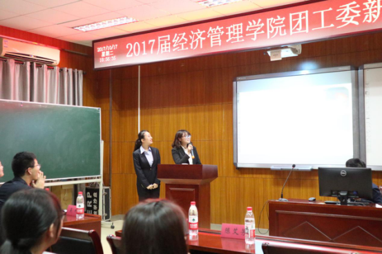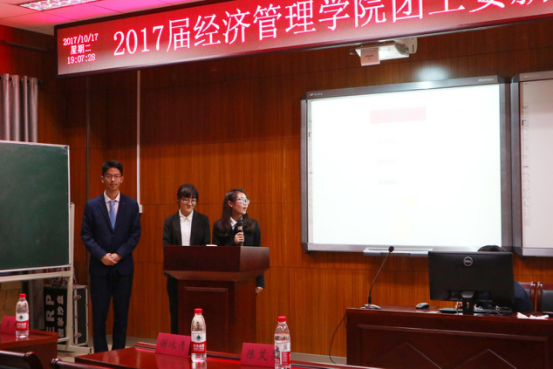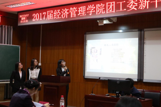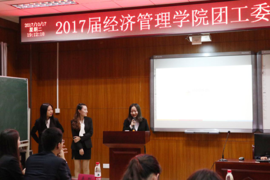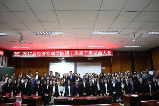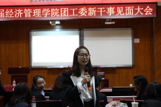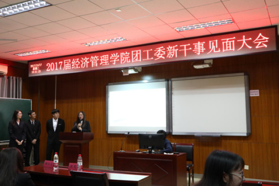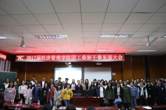 2017年10月17日,南京林业大学经济管理学院团工委2017级新干事见面大会在经管院C103教室举行。在任雯倩同学的主持下,见面大会于18:30正式开始。经济管理学院团委书记陈艾芳老师,2017级辅导员谢冰清老师,各部门部长以及各部门新干事出席了本次大会。