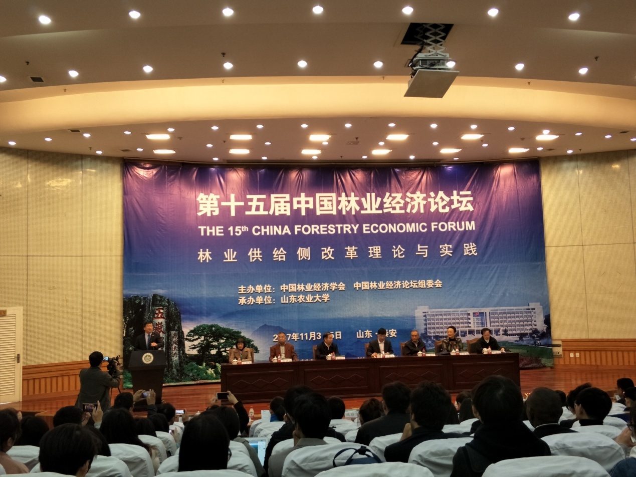 2017年11月3日-5日, “第十五届中国林业经济论坛-林业供给侧改革理论与实践”在山东农业大学隆重召开,会议由中国林业经济学会和中国林业经济论坛组委会主办,山东农业大学承办。来自国家林业局经济研究中心、中国林业科学研究院、北京林业大学、南京林业大学、东北林业大学、福建农林大学、浙江农林大学等高等院校与科研院所的300多名专家学者、师生代表齐聚一堂,围绕“林业产业与贸易”、“森林生态安全和林产品供给”、“林业改革与国有林区发展”、“森林资源可持续经营与管理”以及“农村社会发展与林业经济”等当前林业经济领域的热点和焦点问题进行了深入的学术交流。 应论坛邀请,我院20多位教师和研究生参加了此次论坛。赵庆建副教授、袁恬博士、廖冰博士等分别作了题为《林浆纸供应链中嵌入式碳流建模与分析》、《天然林禁伐对全球木材均衡市场的影响分析》及《生态文明指标优化与权重计量的PSIR-SEM方法研究》等分论坛汇报,王珊珊、赵瑾璟、吴琳、杨丽颖、朱添金等硕士研究生也汇报了论文。张红霄副院长、杨红强副院长、杨加猛副院长、张敏新教授、张智光教授、沈杰教授及张晖副教授担任本次论坛的主持人及点评专家。
