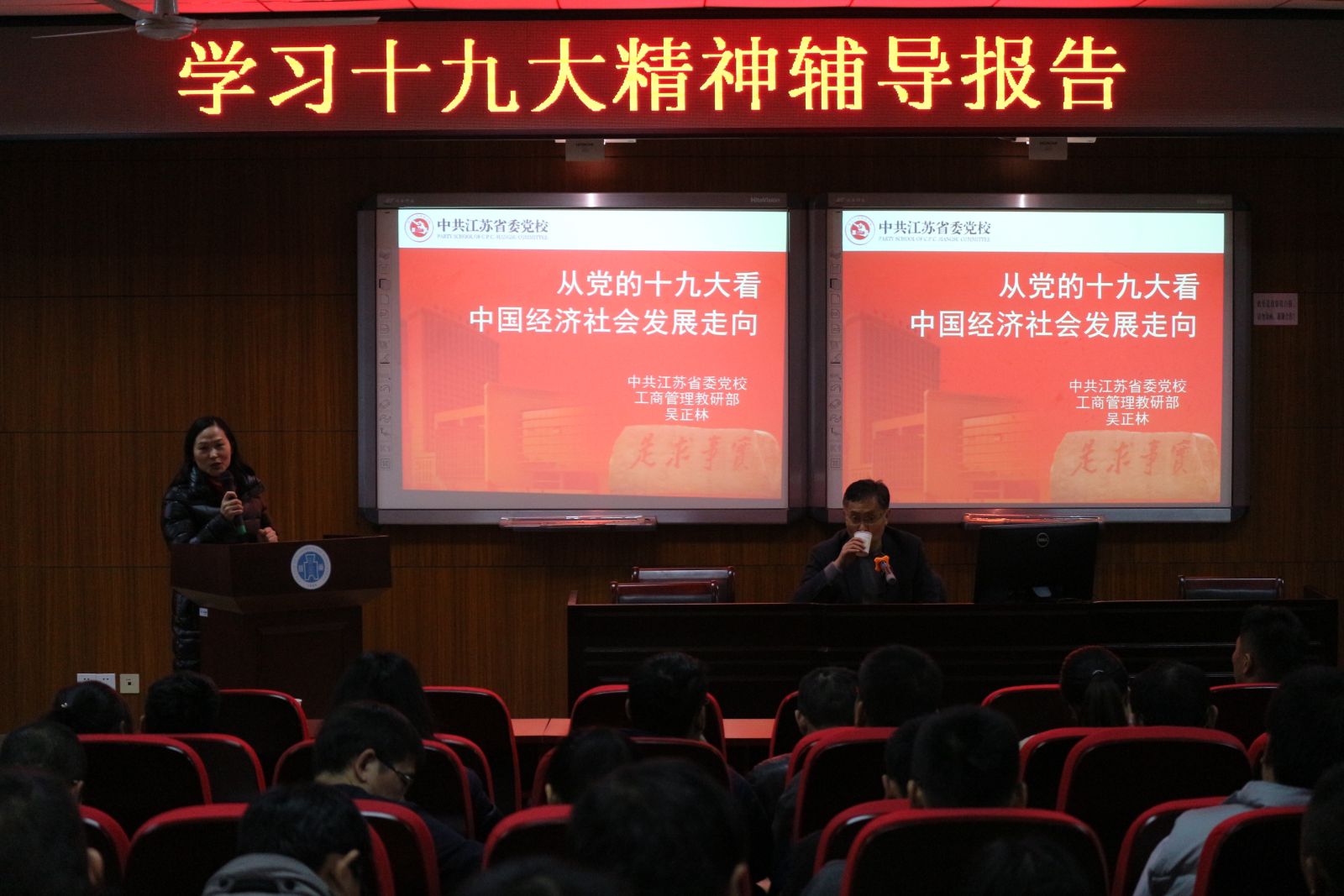 为深入学习宣传贯彻党的十九大精神,落实学校《关于认真学习宣传贯彻党的十九大精神的通知》的工作部署,12月14日下午,经济管理学院党委邀请中共江苏省委党校工商管理教研部吴正林教授来院,作了题为《从党的十九大看中国经济社会发展走向》的报告,报告会由院党委书记高晓琴主持。
