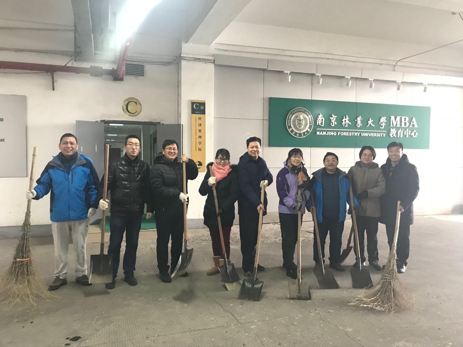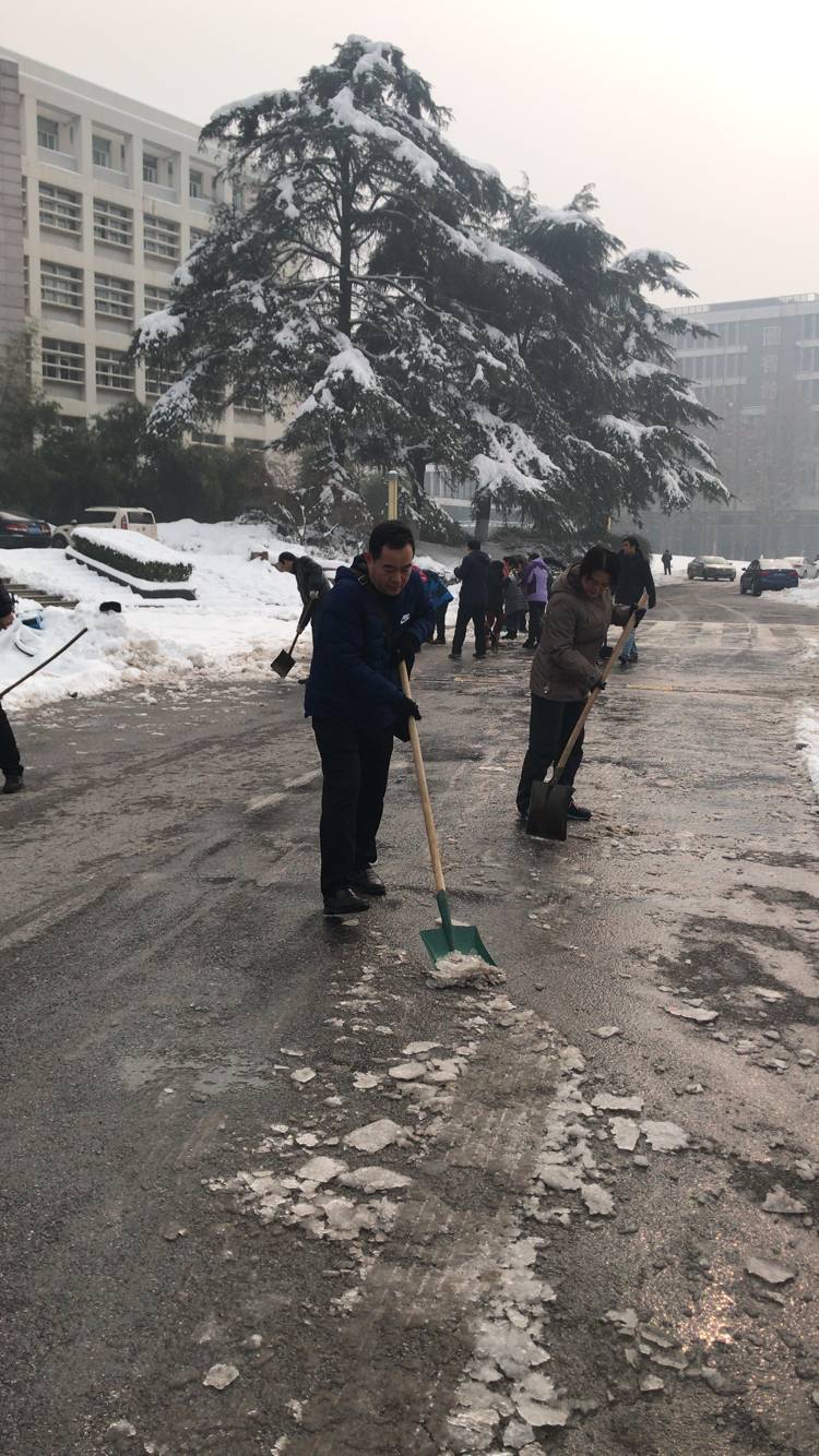 1月29日上午10点,我院老师们带着工具,在经管院楼门前整装出发去逸夫楼前的主干道扫雪。
