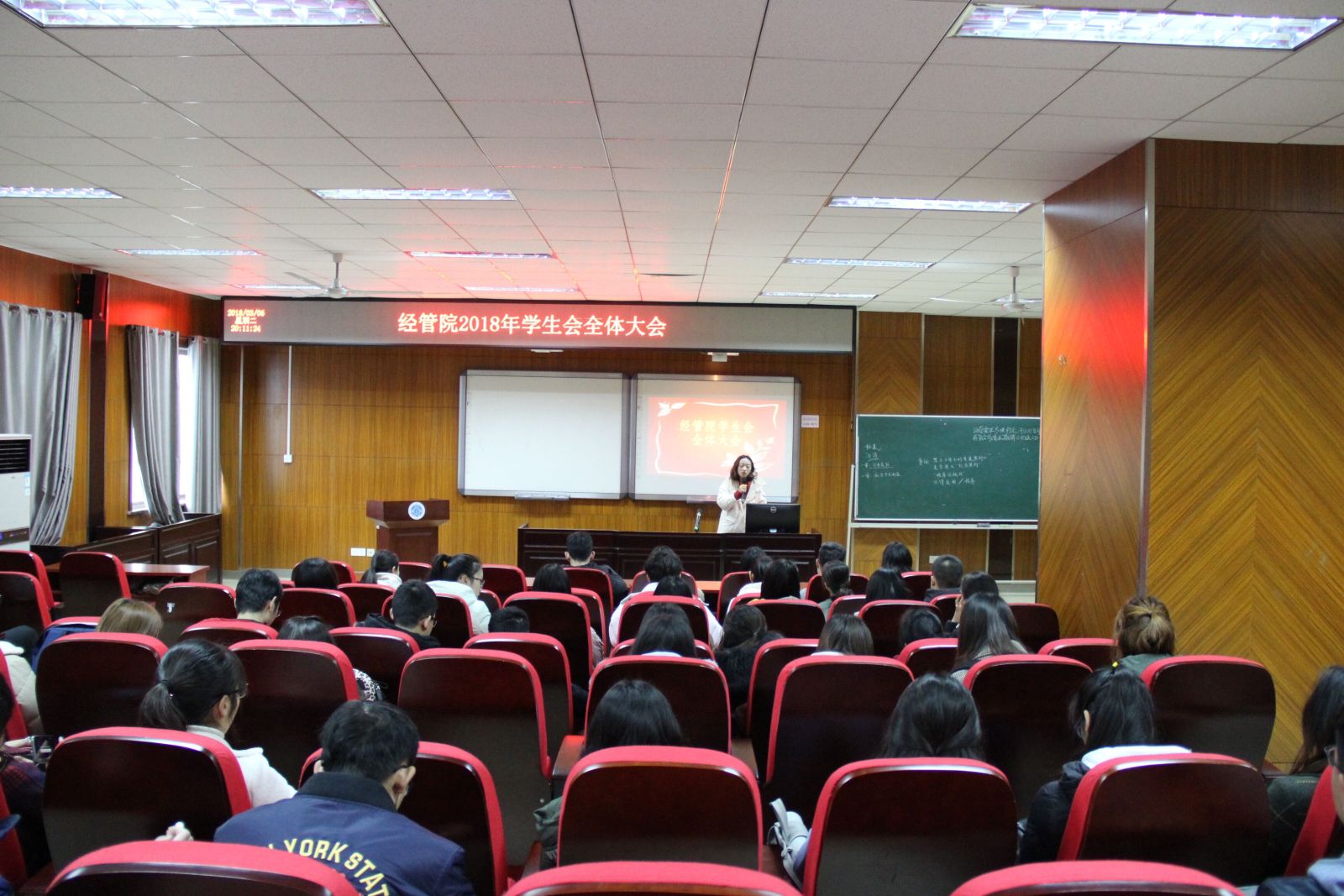 2018年3月7日,经管院在院楼c105举办了学生会全体大会,辅导员谢冰清老师,学生会付敏主席,辉煌耀东常务副主席,王贤副主席,申一凡副主席,陈红副主席,以及各部门部长和干事到场。
