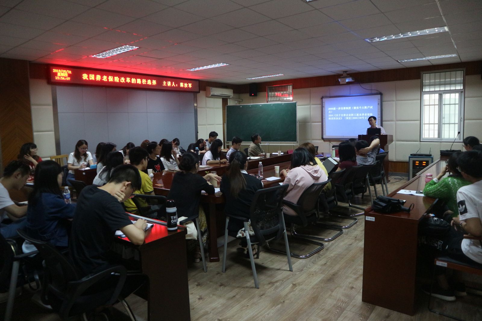 陈汝军处长首先对社会保障的内涵和社会保障运行的机制进行了详细讲解,提出社会保障地位和作用的重要性。接着详细介绍我国养老保险的基本组成及城镇职工养老保险改革的历程,并对我国养老保险选择的路径进行深入分析,对分税制下中央和地方财权和事权的划分及其政策进行了解读。最后,陈汝军处长对我国养老保险的改革提出了相关建议与意见,在座老师与同学受益匪浅。