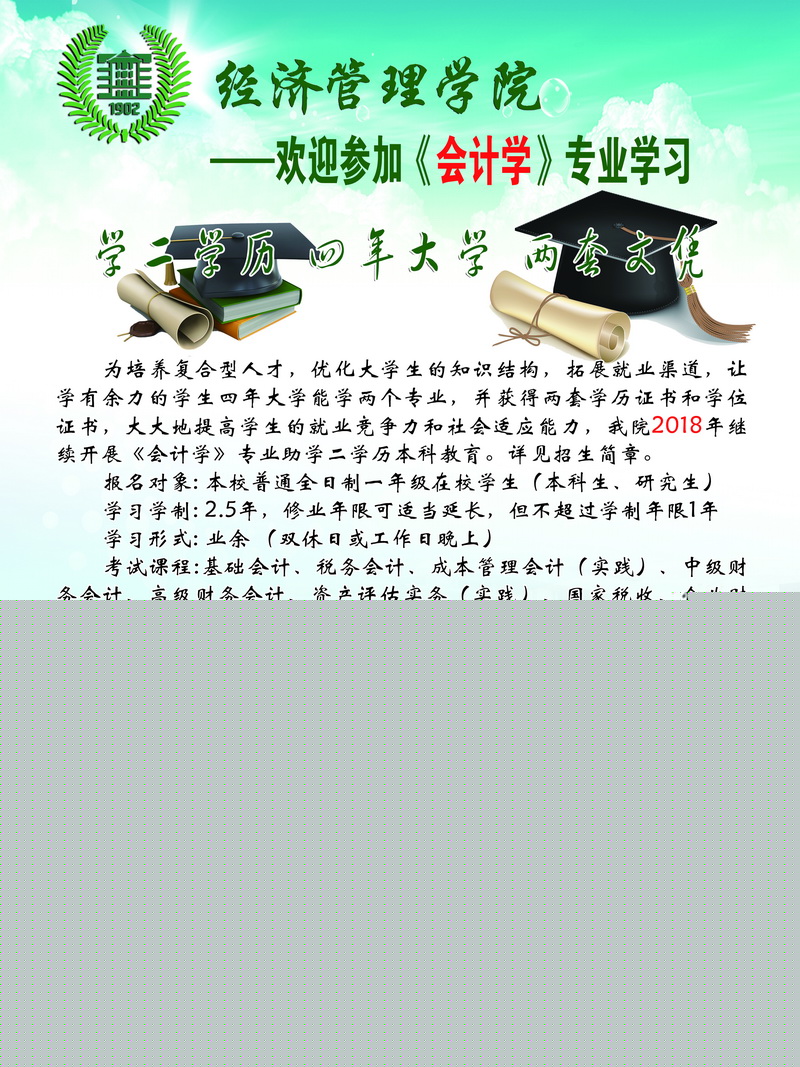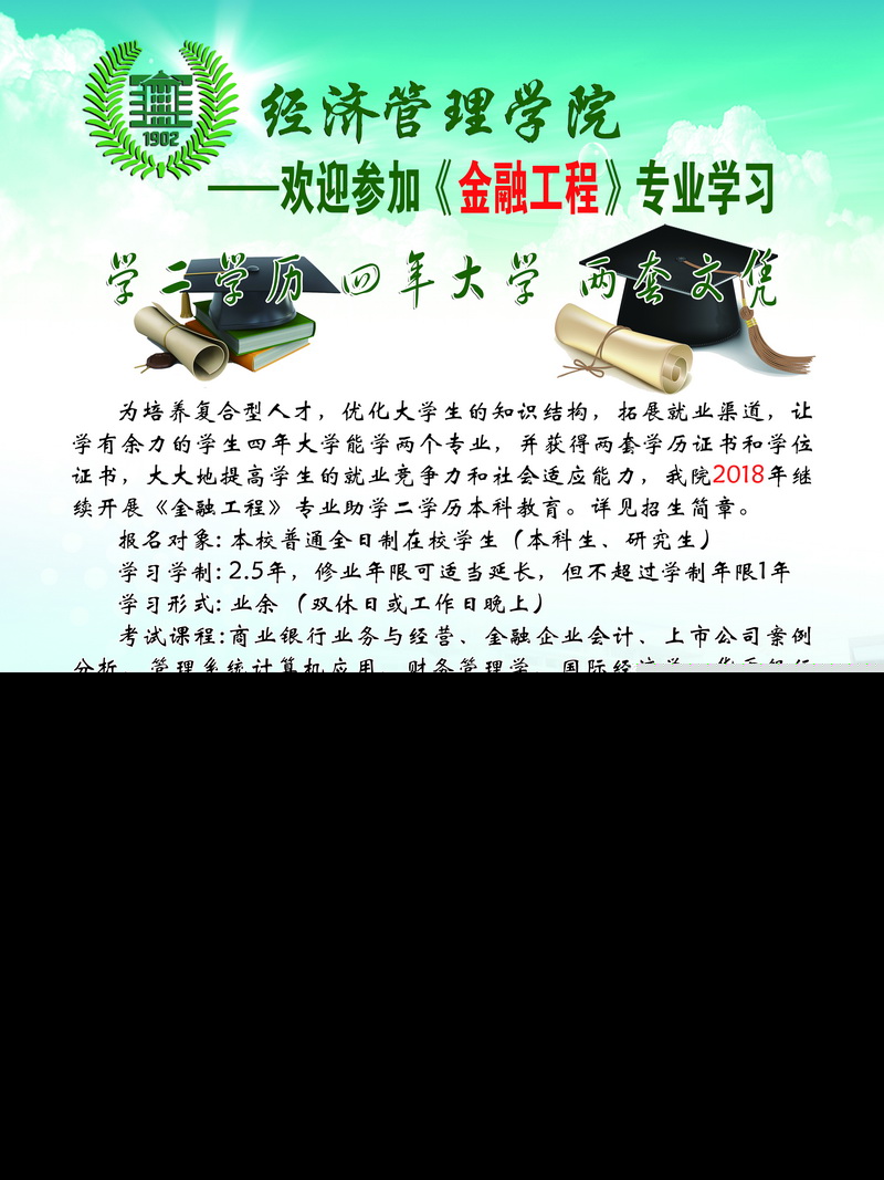 为了满足广大学生的需求,努力培养复合型人才,优化大学生的知识结构,提高学生就业能力,经江苏省教育考试院批准和研究决定,我院于2018年开招二学历本科《金融工程》和《会计学》及《电子商务》专业,面向全校普通全日制在校学生(含研究生)招生,即日起咨询报名。