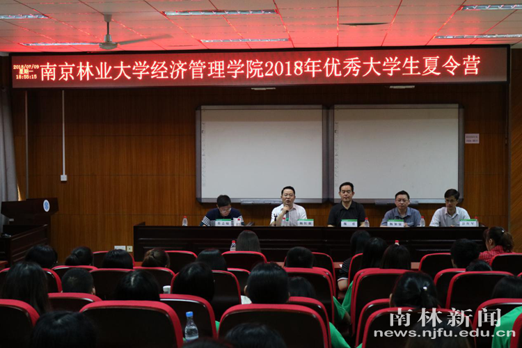 【南林新闻中心讯】南京林业大学经济管理学院第三届(2018年)全国优秀大学生夏令营于7月9日正式拉开帷幕,来自南京林业大学、中南林业大学、浙江农林大学、福建农林大学、西南林业大学等6所高校的40名优秀大学生齐集南林,参加为期4天的多彩活动。开营仪式于7月10日上午在经管院C105会议室举行。研究生院常务副院长杨红强,经管院党委书记魏勇,经管学院副院长(主持工作)杨加猛,经管学院副院长彭红军等出席开营仪式。仪式由经管院党委副书记兼副院长蔡志敏主持。 开幕式现场 杨红强对各位参加活动的营员表示欢迎,并介绍了南京林业大学的发展历史,文化底蕴及研究生教育基本情况。杨加猛介绍了经管院的发展现状、学科建设状况及导师队伍,鼓励各位优秀大学生营员们积极报考经管院研究生。蔡志敏向营员们介绍了本次夏令营的日程安排与活动中的一些注意事项。彭红军宣布南京林业大学经济管理学院2018年全国优秀大学生夏令营正式开营。开幕式后,学院领导与全体营员合影留念。 本次夏令营旨在促进国内高校经济管理学科优秀学生之间交流,加强青年学生对南林经济管理学院的了解,鼓励和支持热爱科研、品学兼优且综合素质高的优秀学生加入南林经管院继续深造。 听取讲授讲座 夏令营期间,研究生院招生办主任葛昊向营员们详细介绍了我校研究生招生政策,并对营员们提出的问题进行解答;彭红军就经管院学科建设及博硕士点情况进行了详细介绍,鼓励广大同学们积极报考;营员们先后听取了由张智光教授主讲的“生态文明:新时代的发展观”,由范金教授主讲的“江苏推进高质量发展的重点和难点问题”两场主题报告会。专家们的精彩讲述让同学们领略了南林深厚的学术底蕴。 在随后的时间里,夏令营营员们将分组选取当前社会经济中的热点问题进行专题调研,并撰写调研报告、进行专题汇报。 “本次夏令营开幕式第一天收获的太多,希望通过此次夏令营,我们不仅能学习到相关的专业知识,也能增长我们的人生经历,像南林这样的宝贵机会,实在是难能可贵!”来自福建农林大学的何世桢如是说道。 合影