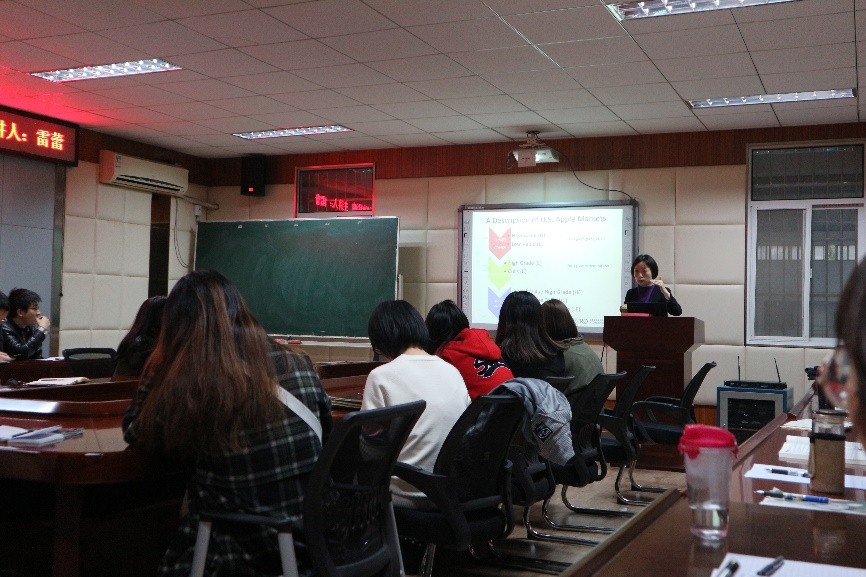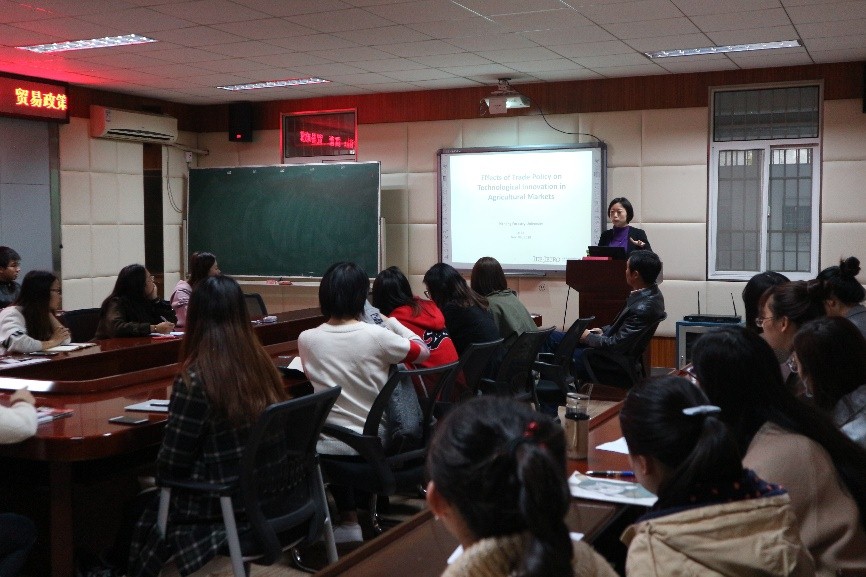 11月7日下午,我院邀请雷蕾老师在教11楼C208教室举行题为“贸易政策对农产品市场科技创新的影响”的研究生“水杉”学术讲堂活动。雷蕾老师是日本亚洲经济研究所(IDE-JETRO)研究员,博士毕业于美国康奈尔大学应用经济及管理系。致力于从可持续农业发展、环境污染、气候变化等角度进行发展经济和国际贸易方面研究。曾在Agricultural Economics,Applied Economic Perspectives and Policy,China Economic Review等一系列农业经济和经济学期刊发表论文,并撰写相关领域书籍章节。领导及参与中国国家自然科学基金,美国农业部,以及日本文部省多项农业、贸易、环保相关的课题。与联合国工业发展组织(UNIDO)、联合国贸易和发展会议(UNCTAD)、以及亚洲开发银行(ADB)广泛合作,发表报告。多在世界贸易组织(WTO Public Forum)以及联合国气候大会(UNFCC COP)等平台发表相关研究成果。