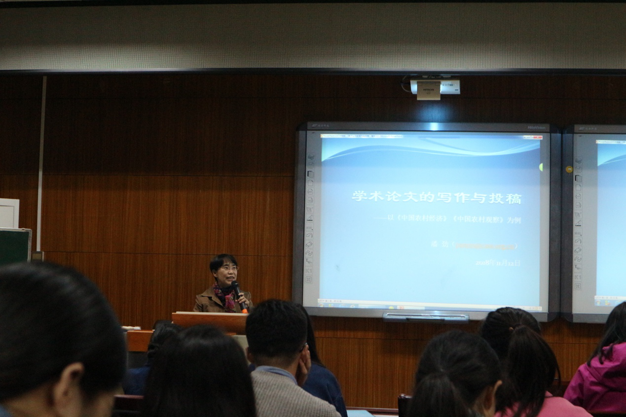 11月12日晚上,我院邀请潘劲老师在教11楼C103教室举行题为“学术论文的写作与投稿”的研究生“水杉”学术讲堂活动。潘劲老师是中国社会科学院农村发展研究所研究员,《中国农村经济》《中国农村观察》创新工程总编辑、副社长兼编辑部主任,发表《红林村:一个京郊山村的经济社会变迁》《烟庄村: 一个劳动力流出村庄的经济社会变迁》、《农产品行业协会的治理机制研究》等专著十几部,发表《中国农民专业合作社:数据背后的解读》、《农民合作社与村两委的关系》等论文上百篇,曾获2018年“中国农村发展研究奖”、2011年“中国合作经济研究成果奖”和2003年“孙冶方经济学奖”。