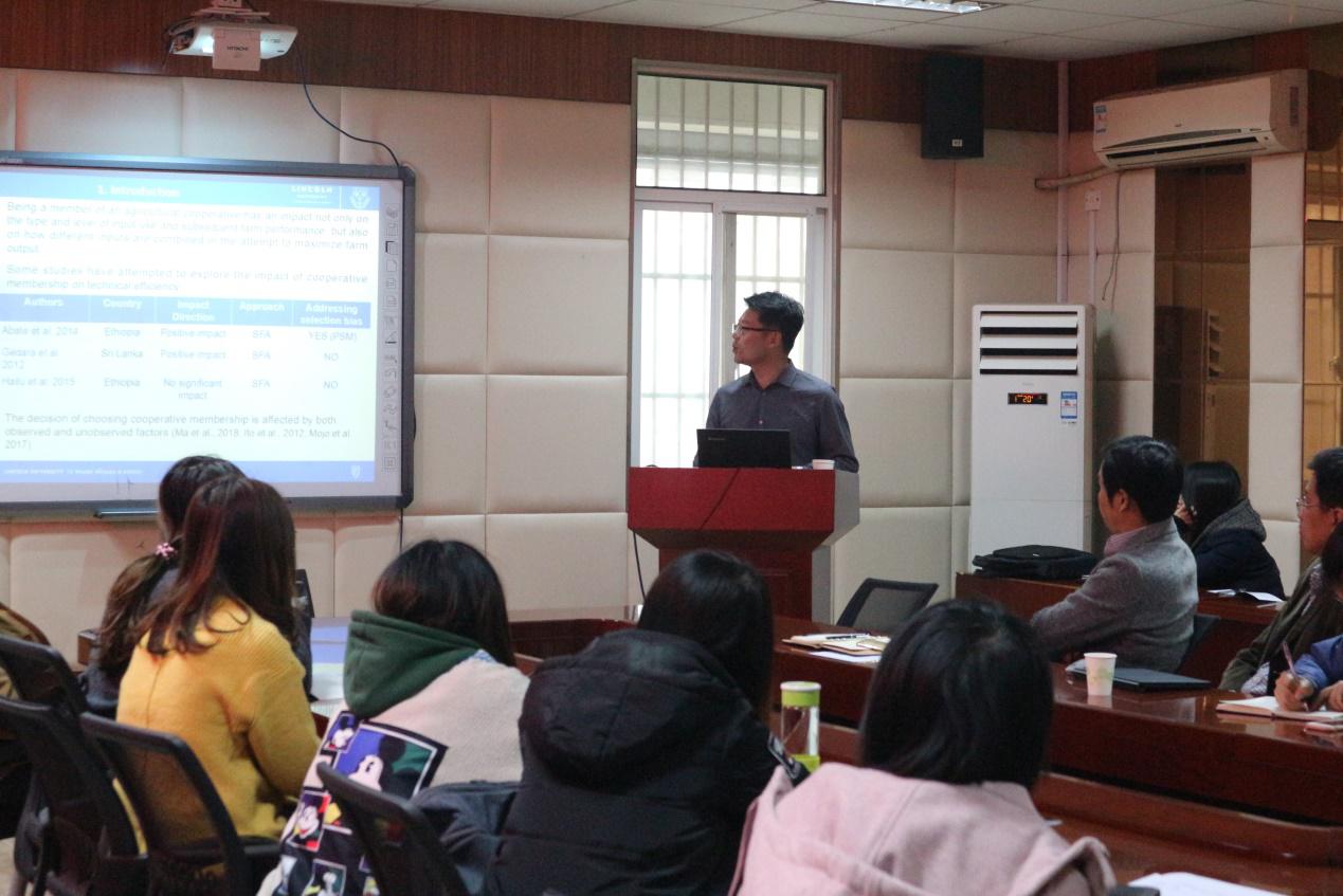 本次讲座主要介绍了加入农业合作社如何影响作物生产技术效率的相关内容。马旺林博士从引言、分析框架、研究方法、数据分析、研究结果、结论等六个部分对整篇论文进行细致的介绍,通过提问题的方式与参加讲座的老师及同学产生良好的互动。在讲座最后马旺林博士还对同学们提出的关于论文中较为新颖的研究方法使用和数据适用性等疑虑进行了的详细耐心的解答。