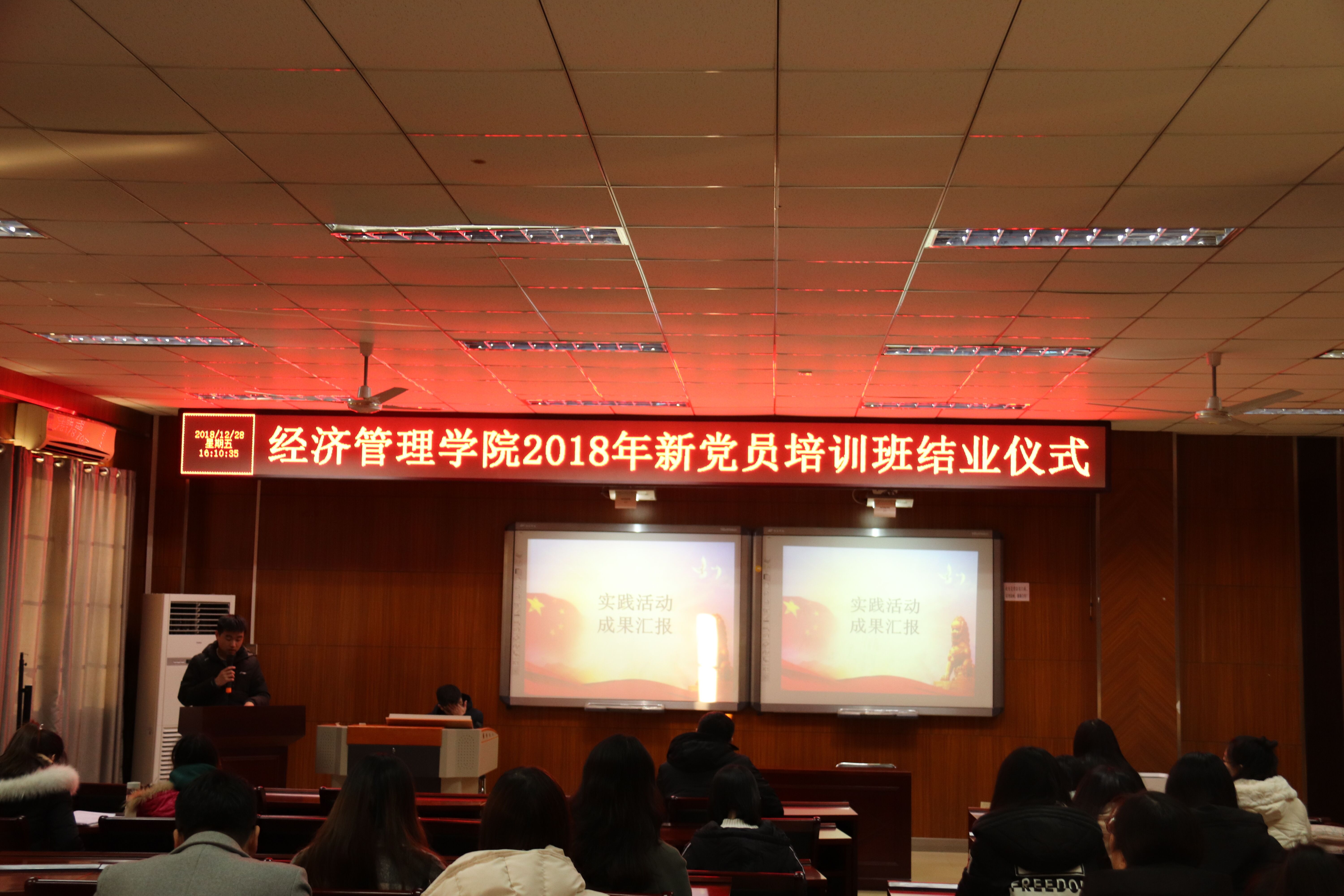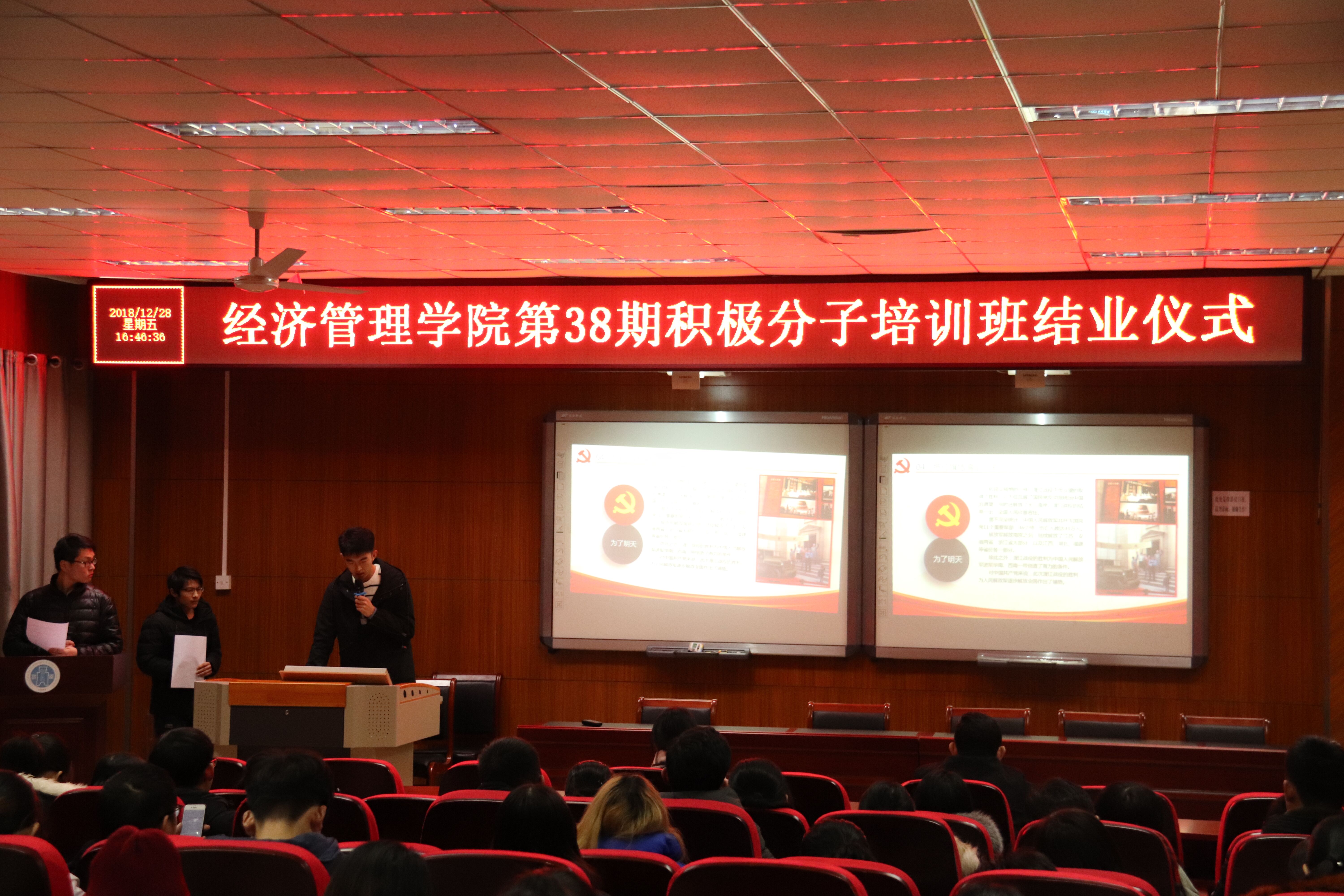 2018年12月28日下午4点,经济管理学院第38期积极分子暨2018年新党员培训班党课结业仪式在经管院C103和C105教室进行,经管院党委书记魏勇老师,党委副书记副院长蔡志敏老师,党委组织员16级辅导员赵淑颖老师,18级辅导员齐蓓老师出席党课结业仪式。