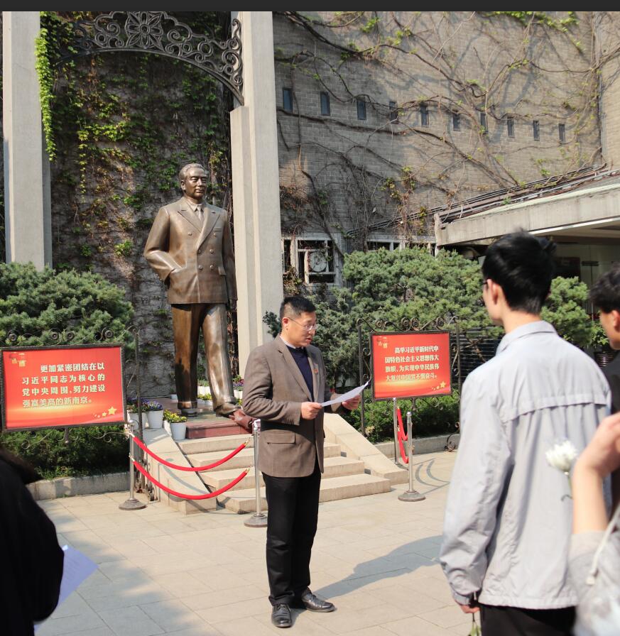 接着,校关工委常务副主任、原副校长赵林老师现场为积极分子们教授党课,给学生们讲解了梅园新村的纪念意义和历史背景。“学习周恩来等老一辈无产阶级革命家的精神风范,就是要大力弘扬集体主义和大无畏的无私精神;就是要牢记中国共产党的历史使命,不忘初心,永远保持共产党员先进性;就是要激励我们努力学习,积极向上,做中国特色社会主义的建设者和接班人”。随着教育活动的深入,周总理等老一辈革命先烈的精神深深震撼青年学子的心,积极分子们纷纷于纪念碑前敬献菊花。