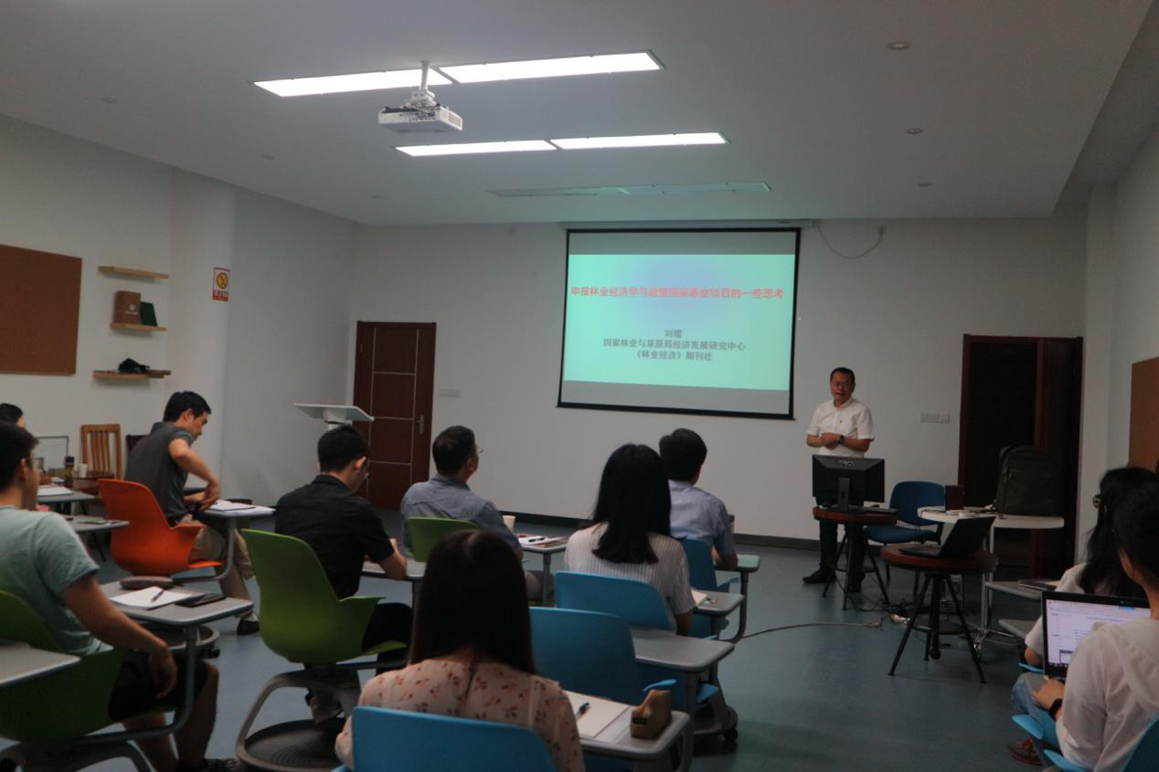 7月8日下午,我院邀请刘璨教授在经管院文科楼B138教室举行题为“申报林业经济学与政策国家基金项目的一些思考”的学术交流活动。刘璨教授首先介绍了经济学的内涵,强调了创新在经济学研究中的难度以及理论分析框架在论文选题中的重要意义,表明学者申请课题研究首先应从客观角度判断研究有否现实意义;随后刘璨教授对当前林业经济理论与政策研究进展进行了相关阐述,就选题、研究价值、国内外文献综述、研究方法、技术路线、研究可行性等方面进行详细的介绍;最后,对创新点及基金申请提出了几点建议。