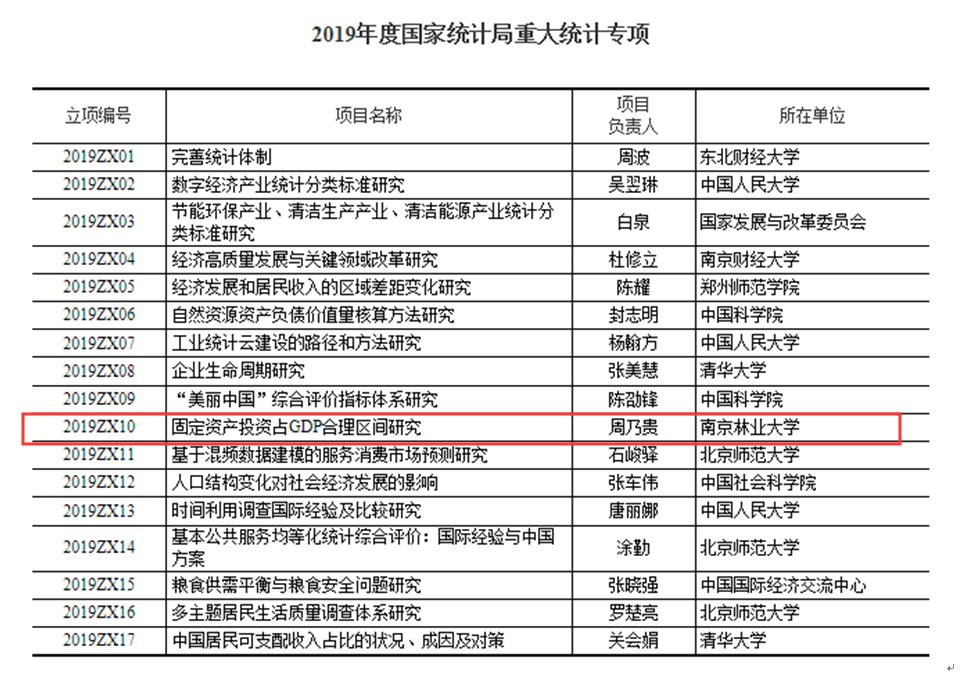 10月31日,全国统计科学研究组织管理办公室公布2019年度国家统计局重大统计专项立项名单,我校周乃贵总会计师的“固定资产投资占GDP的合理区间研究”成功立项。2019年度国家统计局重大统计专项面向全国科研院校和有关单位公开申请,经过严格的资格审查和项目评审,共有17项课题获得立项批准。