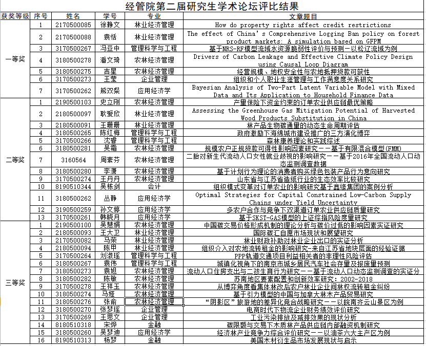 经济管理学院研究生工作办公室根据《南京林业大学经济管理学院第二届研究生学术论坛征文通知》,共收到65篇论文,每个专业由三位专家匿名评审本专业论文,分数取平均值,并经学术不端检测,按专业分配获奖指标评出一等奖7名,二等奖13名,三等奖16名,详细名单见《经管院第二届研究生学术论坛评比结果》。