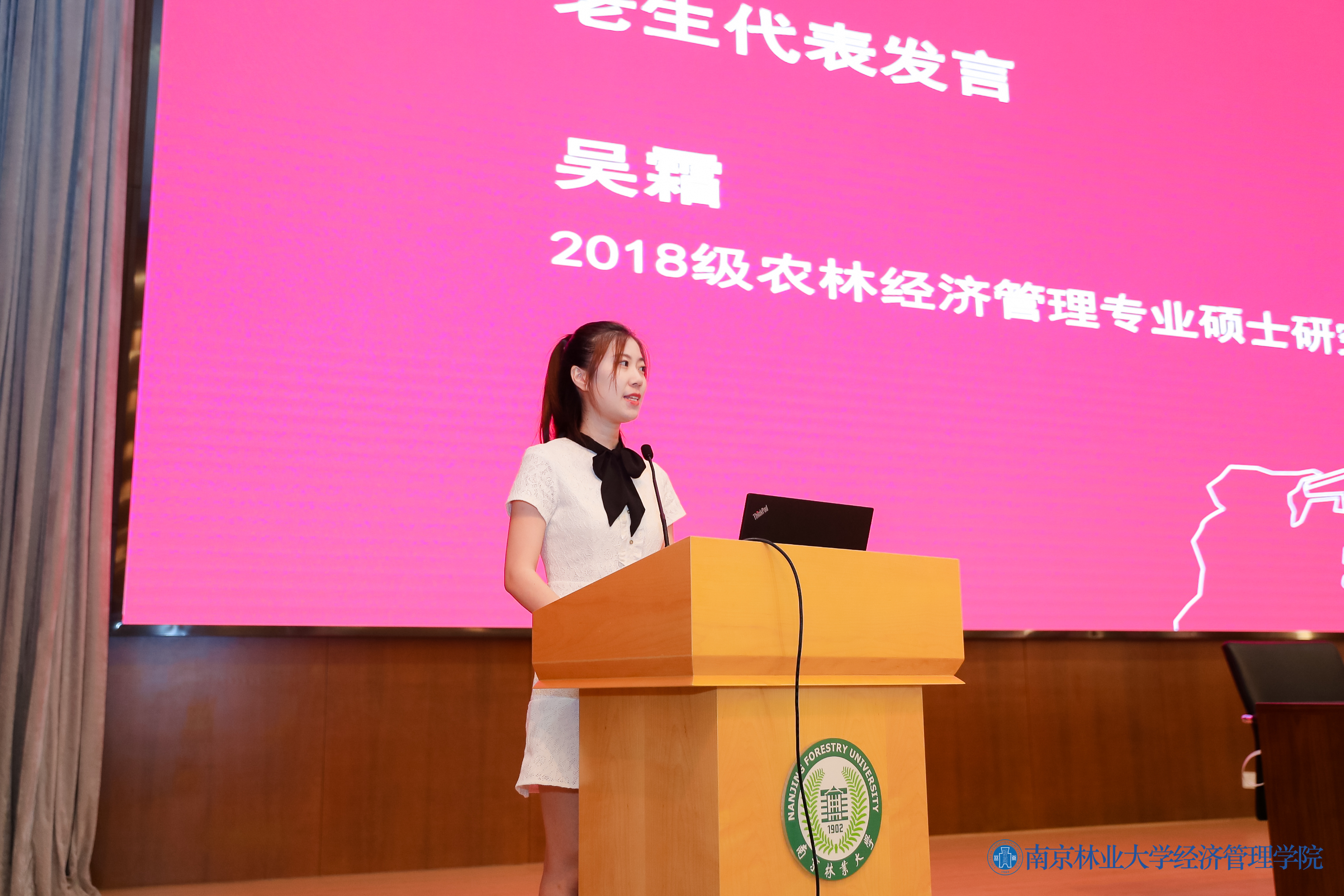2018级农林经济管理专业硕士研究生吴霜代表老生发言。她分享自己的研究生求学路程,鼓励大家要砥砺奋进,不忘初心,永葆学习热情,为实现自己的人生目标而努力。