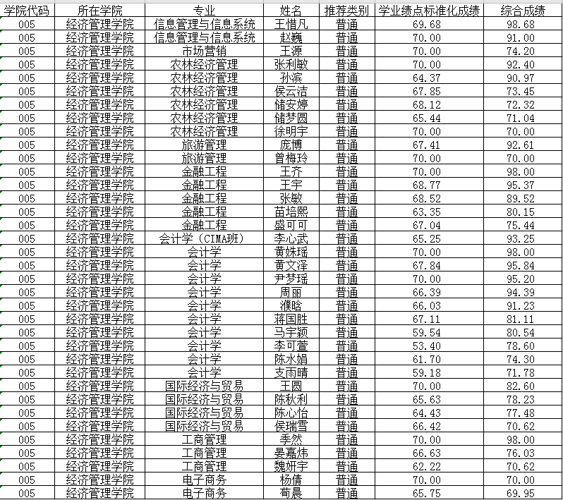 根据《南京林业大学关于做好 2021年推荐免试攻读硕士学位研究生工作的通知》要求和《经济管理学院推荐免试硕士研究生工作实施细则(2020年版)》,经学生个人自愿申请、学院资格审查,综合个人专业成绩、科研竞赛成果等情况,学院推荐遴选工作小组根据申请者的综合考核成绩排序,按推荐名额的1:1确定王惜凡等36名拟推荐学生名单,现公示如下: