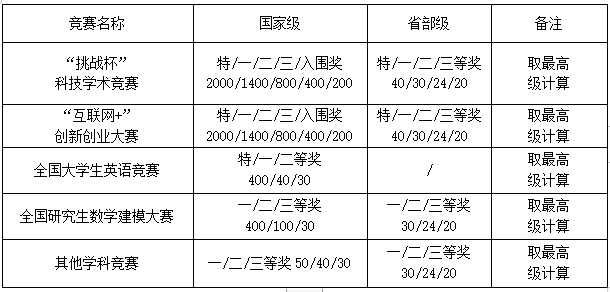注:集体项目负责人获上述分值,其他成员按50%计算;同一内容(项目)参加不同级别的竞赛活动只按最高标准加分,不累加。