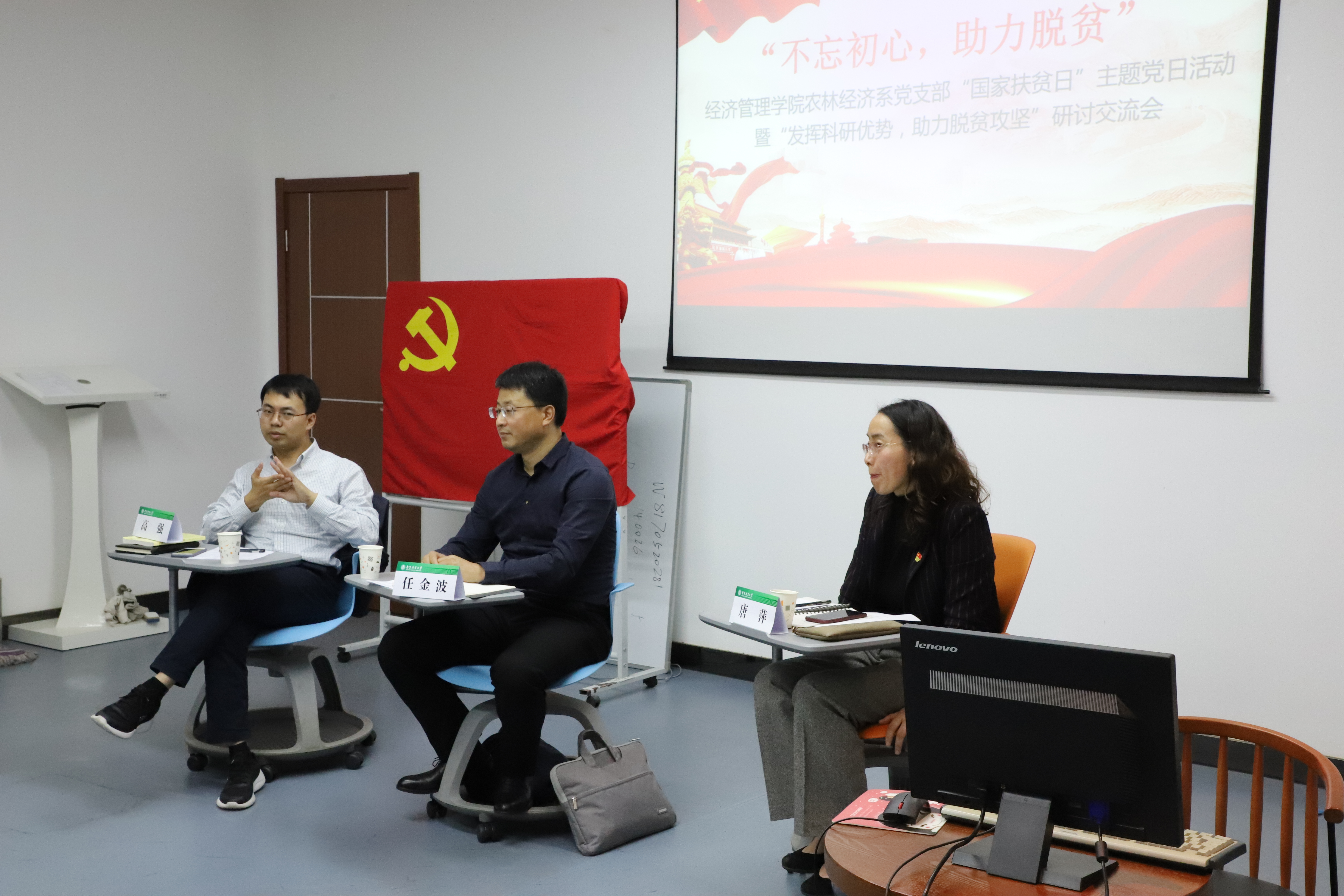 2020年是全面建成小康社会目标实现之年,是全面打赢脱贫攻坚战收官之年。为深入学习贯彻习近平总书记在决战决胜脱贫攻坚座谈会上的重要讲话精神,积极推进教育扶贫攻坚和成果巩固工作,2020年10月15日下午农林经济系党支部举办了“不忘初心,助力脱贫”主题党日活动。 2018-2019省委驻沭帮扶工作队队员,曾任沭阳县马厂镇党委委员,青春村第一书记的我校网信办副主任任金波应邀参加活动,经管院党委书记唐萍、副院长高强、农经系教师党员和研究生参加了此次活动,活动由农经系党支部书记朱海星主持。