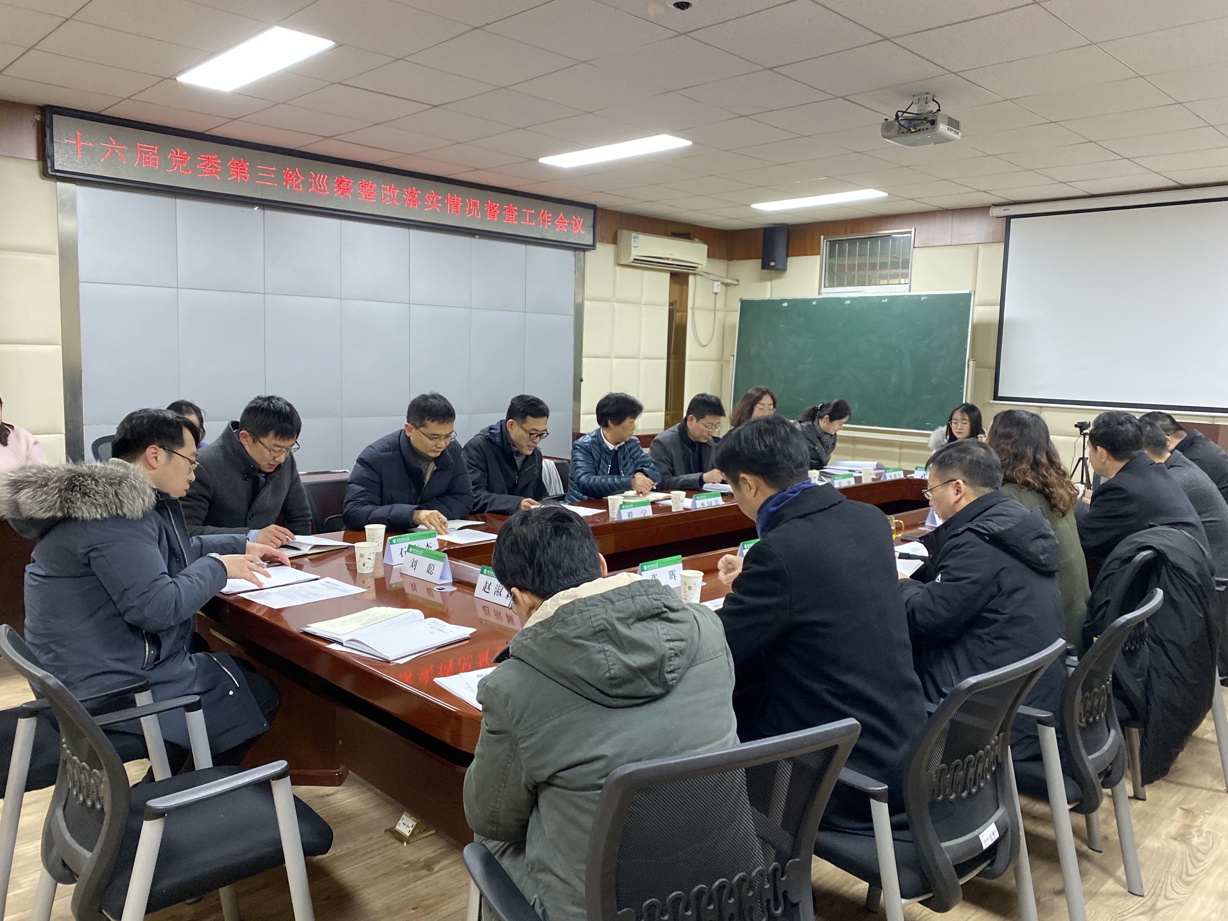 纪委办公室副主任程宁布置督查工作分工。督查组对学院与会人员进行了分组访谈,并查阅了巡察整改情况资料。