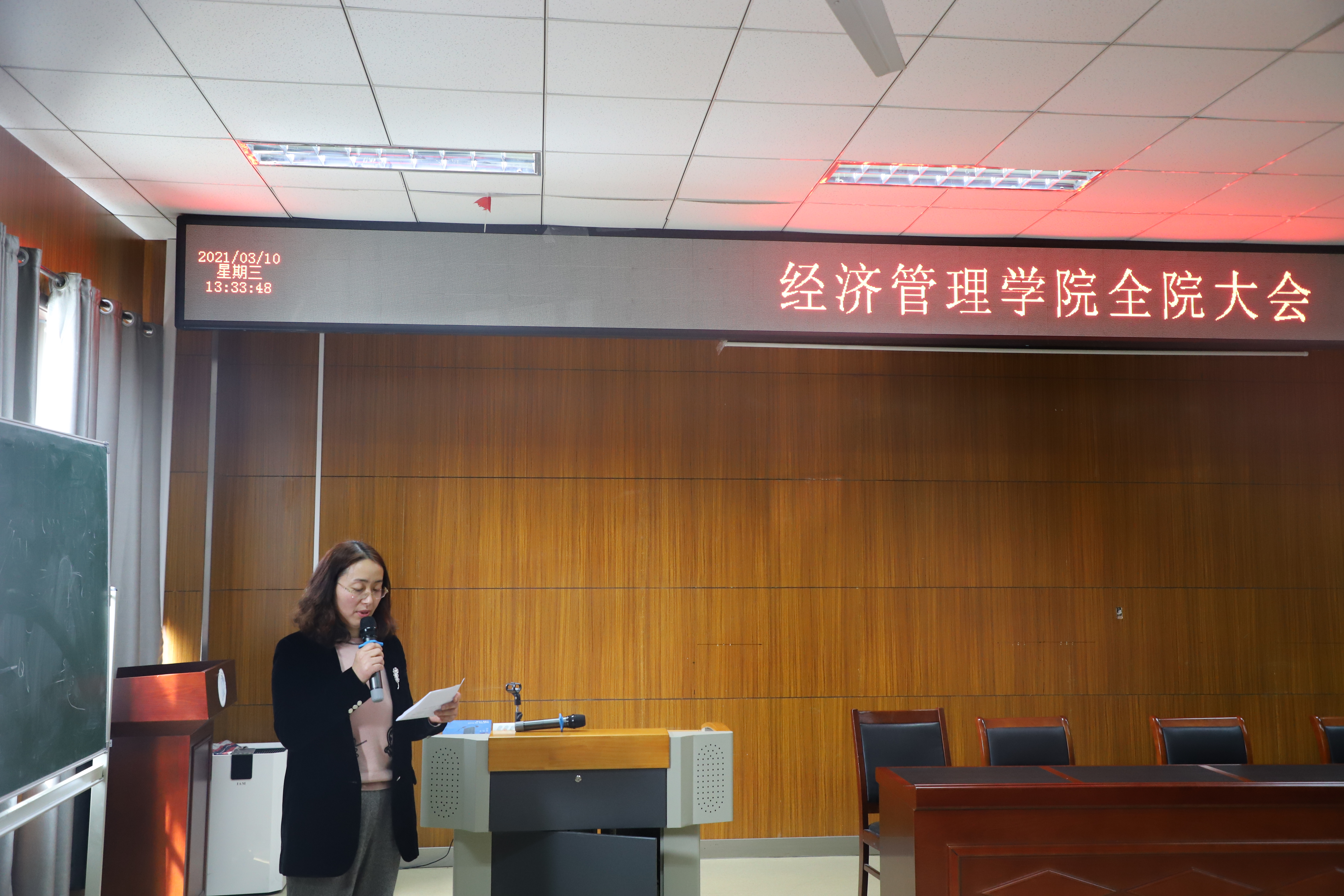 2021年3月10日,经济管理学院在C105教室召开2021年新学期全院大会,总结2020年学院工作,部署2021年重点工作。学院全体教职工参加会议,会议由学院党委书记唐萍主持。