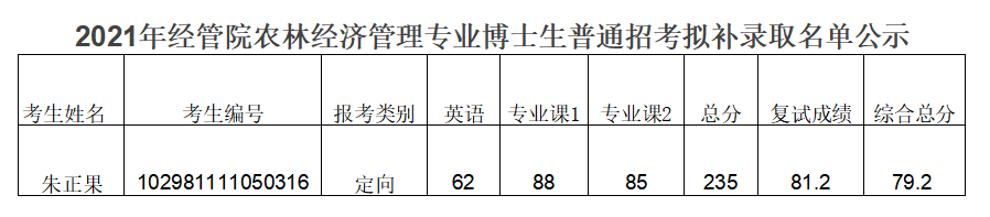 2021年经管院农林经济管理专业博士生普通招考拟补录取名单公示