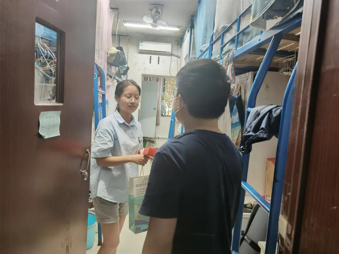 学院教师一行先后前往学院留校学生所在的宿舍楼栋,一方面向宿舍管理员了解我院学生假期留校的整体情况;另一方面,也深入到各个宿舍,询问同学们在校期间的学习和生活情况,代表学院送上了节日的祝福与学校定制的中秋月饼;提醒同学们中秋节的时候给父母打个电话问候一声,为家乡的亲人送上中秋祝福;叮嘱同学们在校期间也要注意安全,以及鼓励备战考研的同学们坚持不懈、勤奋学习,期待同学们收获满意的学习成果。