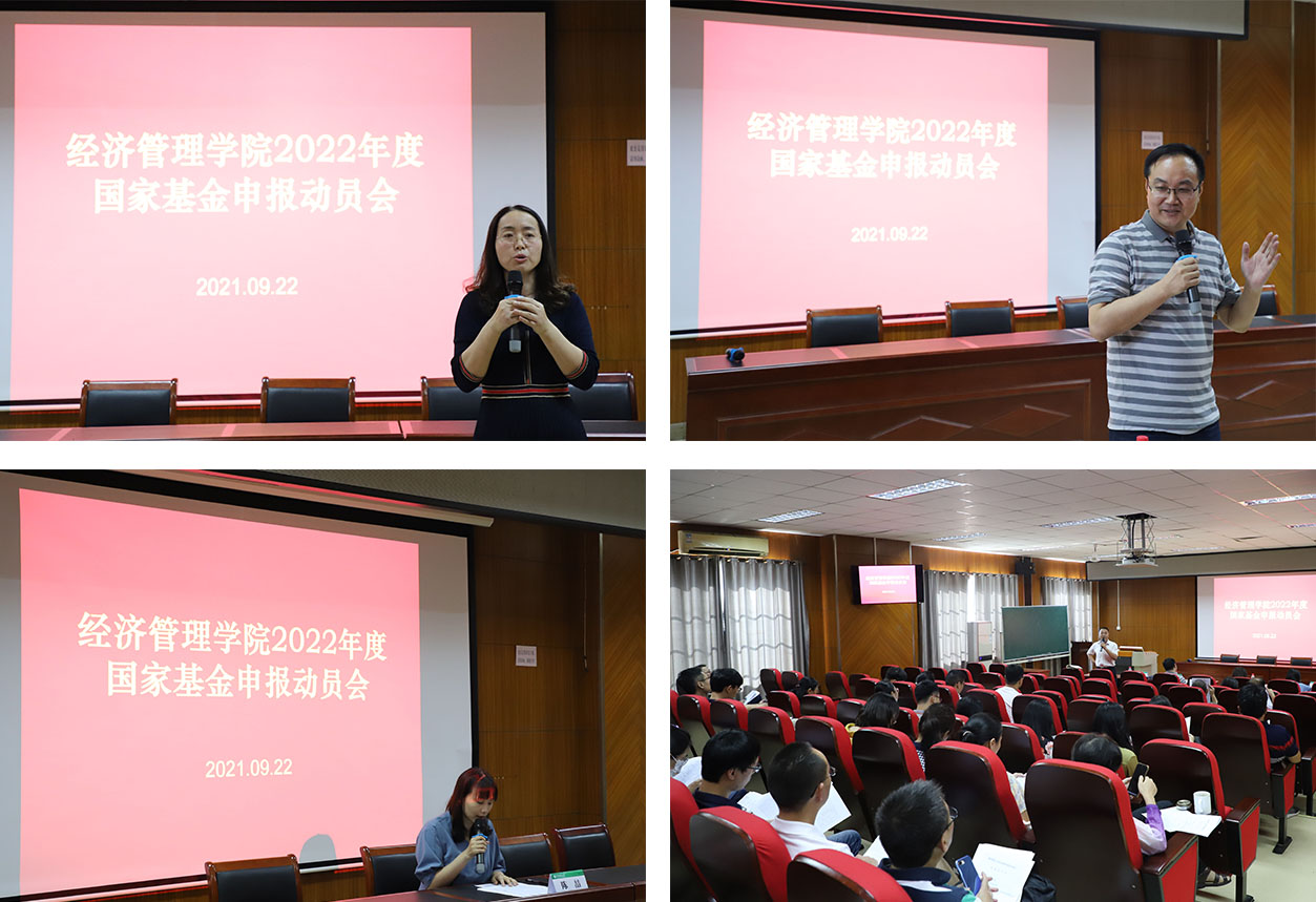 9月22日下午,我院在教11楼C105会议室召开了2022年度国家基金申报动员会,校人文社科处副处长陈相雨、科技处计划科科长陈喆以及学院党委书记唐萍、副院长(主持工作)杨红强出席会议。会议由经管院副院长高强主持,学院符合申报条件的相关教师参加了动员会。