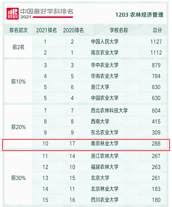 2021年10月25日,高等教育评价专业机构软科正式发布“2021软科中国最好学科排名”,我院农林经济管理学科居“2021中国最好学科排名”全国第10名,位列软科排名前20%。此次农林经济管理学科排名全国共涉及52家涉农高校,其中26家高校进入排名前50%。