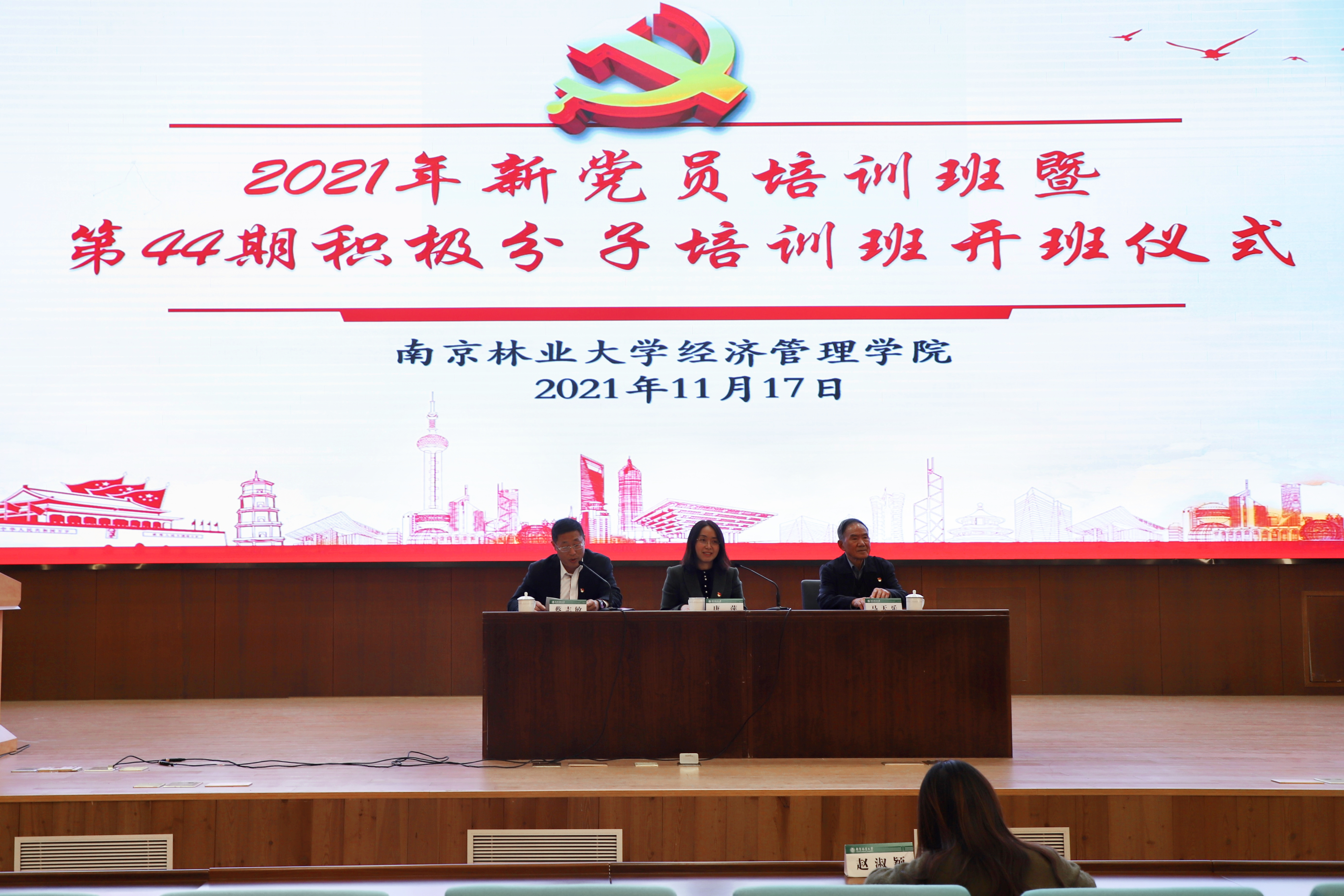 2021年11月17日下午,经济管理学院2021年新党员培训班暨第44期积极分子培训班开班仪式在南京林业大学新图书馆B118顺利举行。经济管理学院农林经济系退休教授马天乐,经济管理学院党委书记唐萍,党委副书记、副院长蔡志敏,学院党委组织员、辅导员赵淑颖老师出席了本次党课开班仪式。此次党课开班仪式由蔡志敏副书记主持,学院200名新党员,184名入党积极分子参加了本次开班仪式。