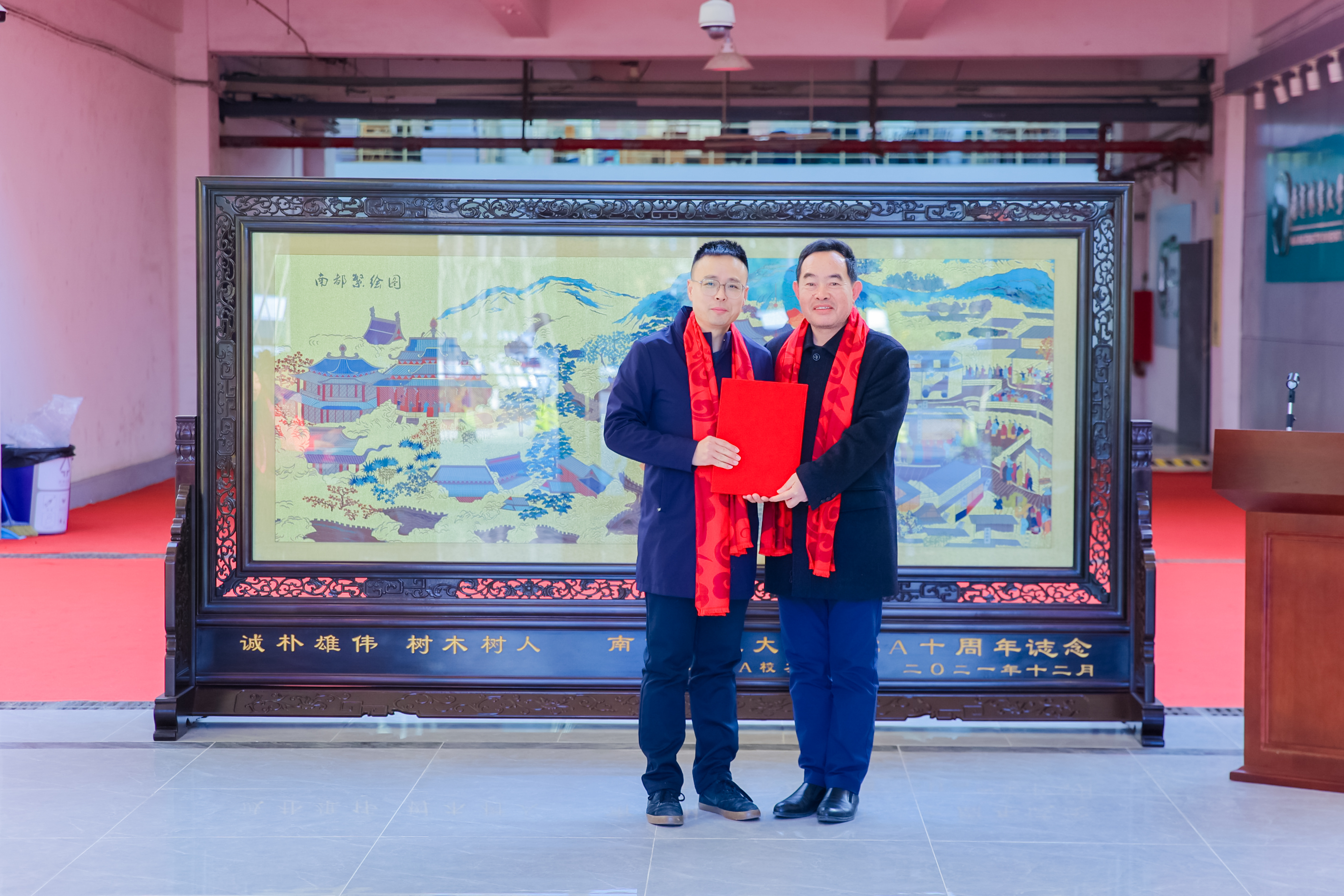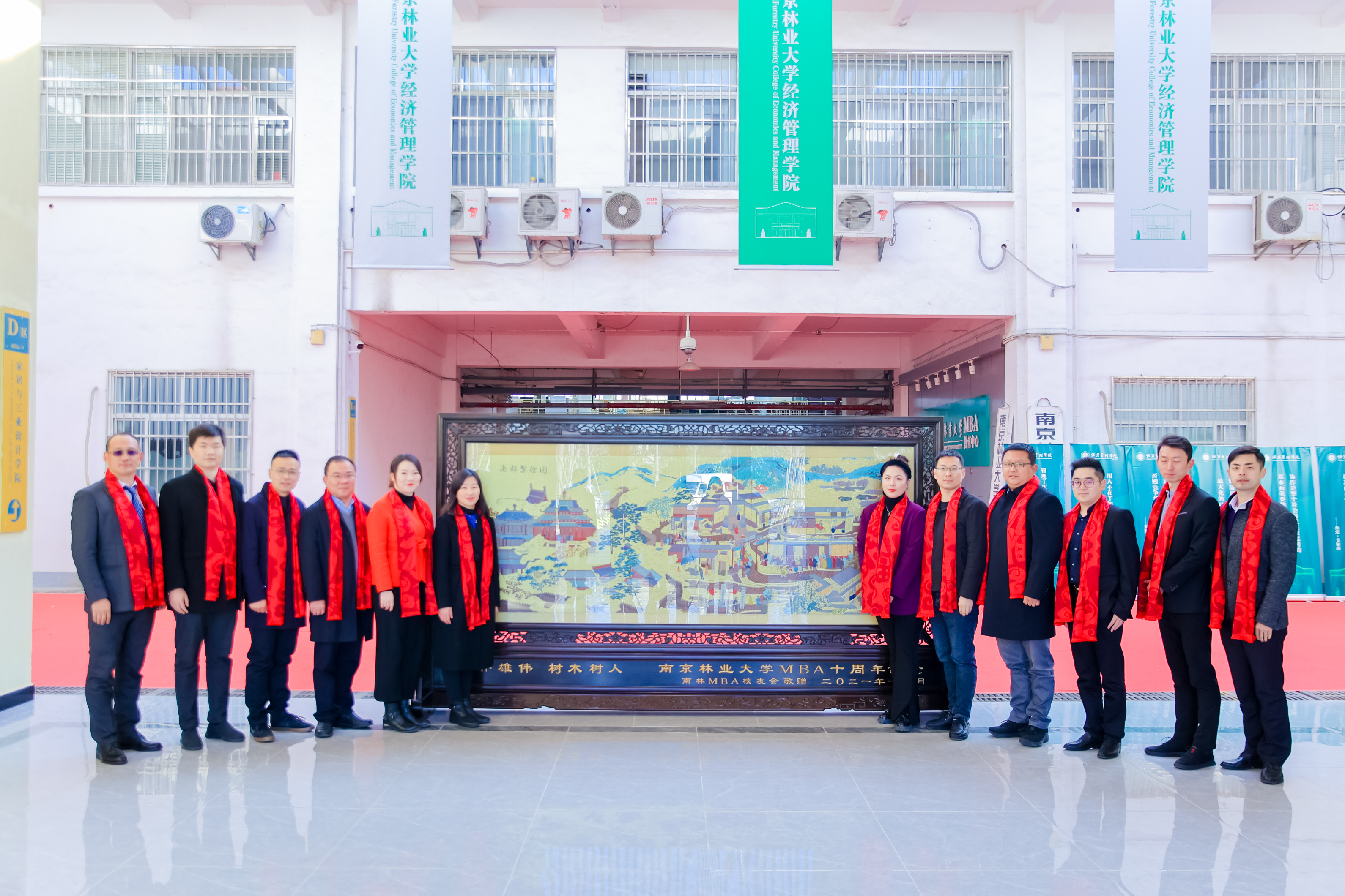 为庆祝南京林业大学MBA创办十周年、配合经济管理学院新大门落成,由MBA校友会发起,120位校友参与,向经济管理学院敬赠云锦纪念屏风“南都繁会图”。屏风表达了校友们对经济管理学院全体老师的感激之情及对新一辈学子奋发图强的殷切期望。