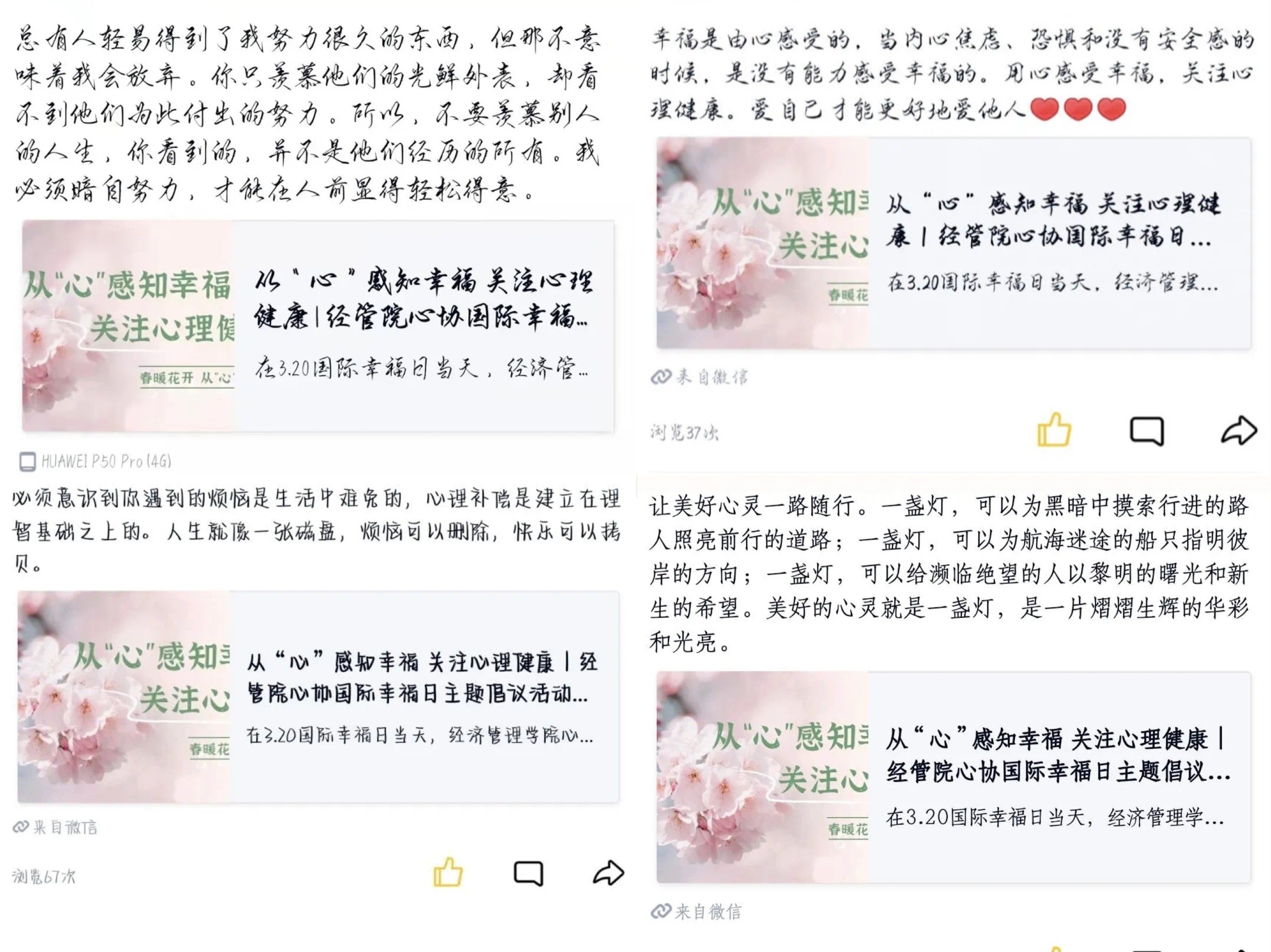 为进一步提升学生心理健康教育育人质量,引导大学生树立“心向阳光、感知幸福、砥砺前行、共创未来”的理念,激发学生向上向善、面向未来的奋斗力量,培养有幸福感的新时代大学生,2022年3月20日,经济管理学院心理健康协会开展“从‘心’感知幸福,关注心理健康”国际幸福日主题倡议活动。