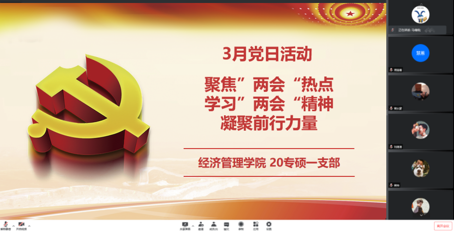 春日渐暖,万物吐新。2022年3月24日晚8点,经济管理学院20专硕一支部全体党员通过腾讯会议线上形式开展了“聚焦‘两会’热点,学习‘两会’精神,凝聚前行力量”的主题党日活动。此次党日活动由组织委员朱志恒主持。